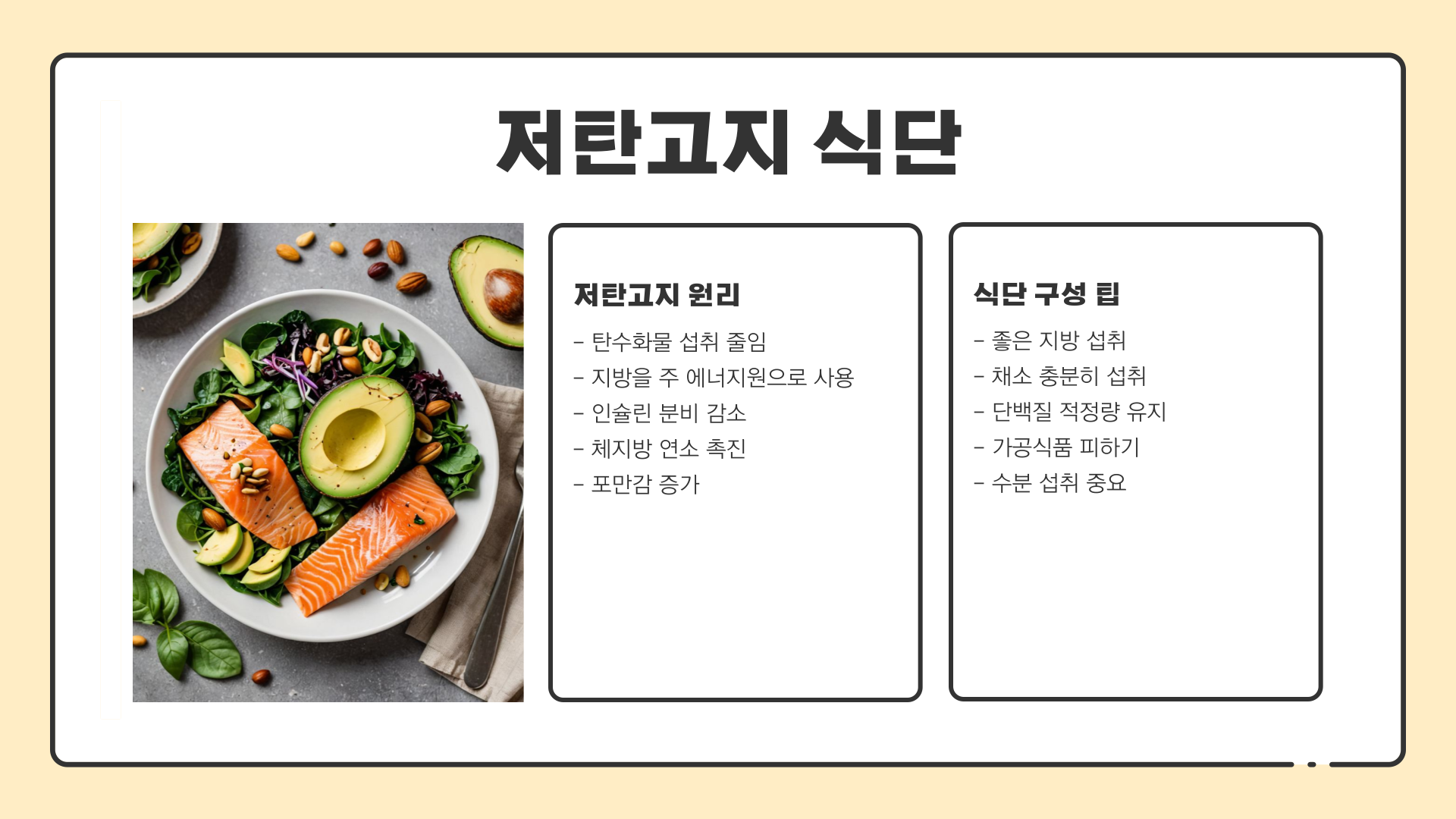갱년기에는 인슐린 저항성이 증가하면서 탄수화물 섭취가 체지방으로 쉽게 변할 수 있어요. 따라서 저탄고지(Ketogenic) 식단이 효과적이에요. 탄수화물 섭취를 줄이고, 건강한 지방과 단백질을 늘려 신체가 지방을 에너지원으로 사용하도록 유도하는 방식이죠. 🥑