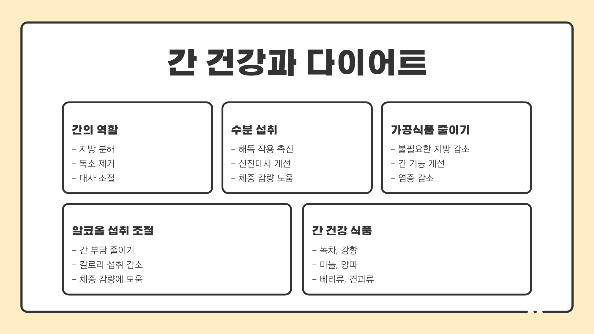 다이어트를 할 때 간 건강이 중요한 이유는 지방을 분해하는 주요 역할을 담당하기 때문이에요. 만약 간이 지방을 잘 처리하지 못하면 다이어트가 어려워져요. 🤔