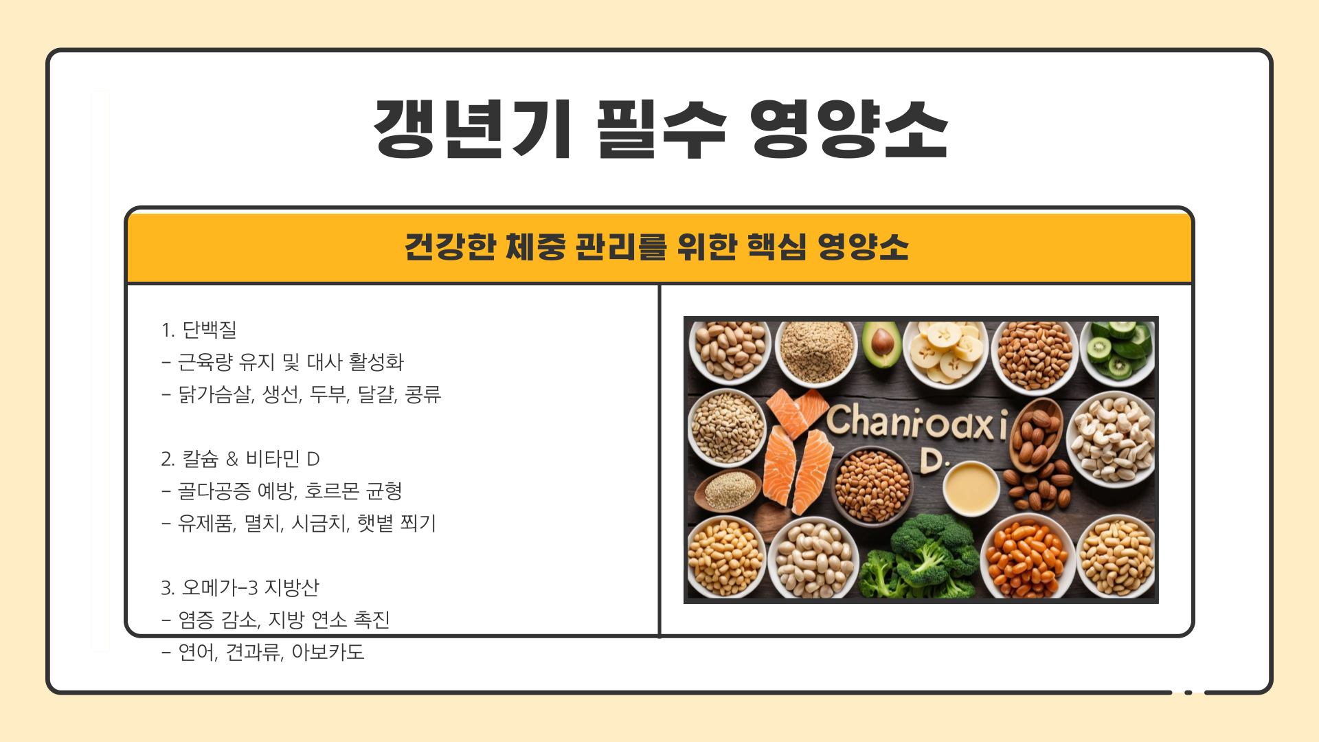 특히 갱년기에는 무조건 적게 먹는 다이어트보다는 영양 균형을 맞추고, 대사를 활성화하는 식단이 중요해요.