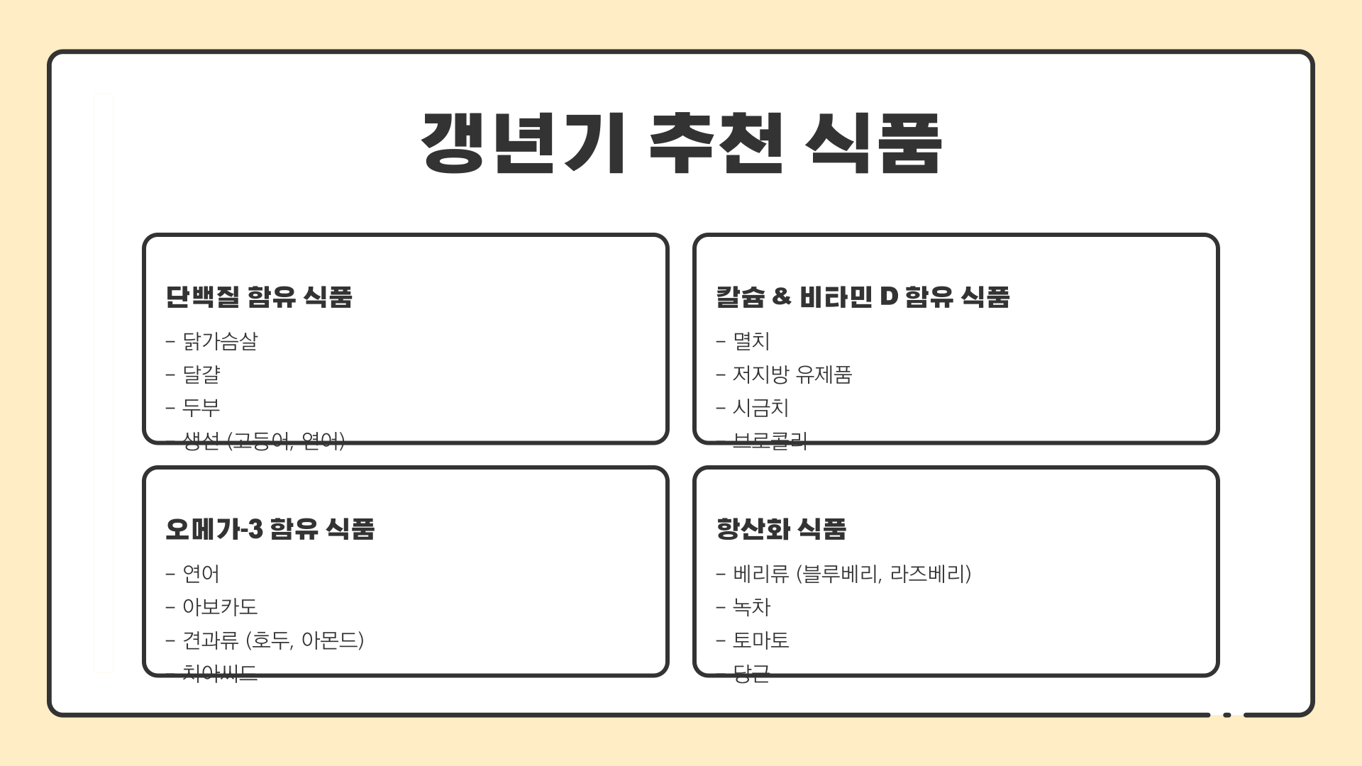 2️⃣ 칼슘 & 비타민 D: 갱년기에는 골다공증 위험이 커지므로, 유제품, 멸치, 시금치와 함께 햇볕을 충분히 쬐는 것이 중요해요.