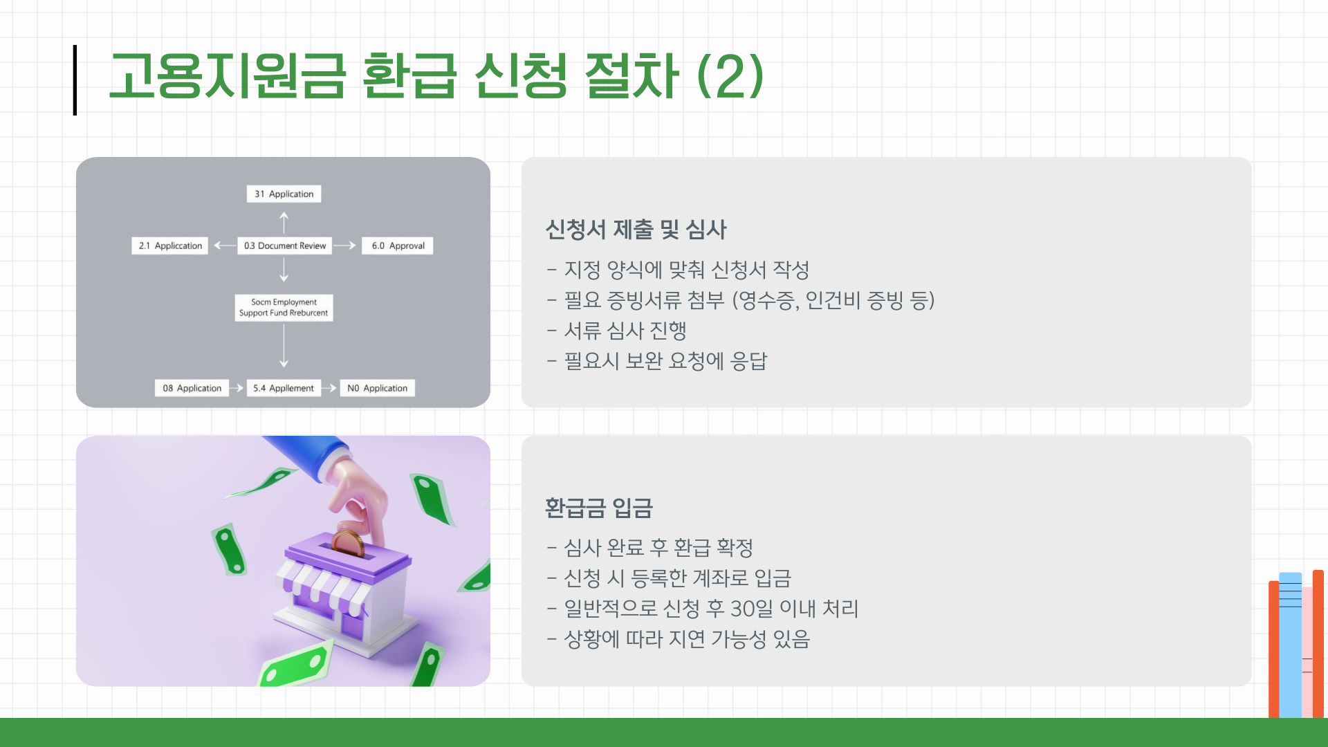 ⑤ 신청서 제출: 지정 양식에 맞춰 작성한 신청서, 영수증, 인건비 증빙 등 첨부