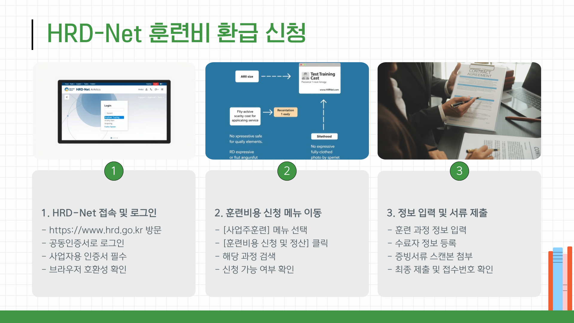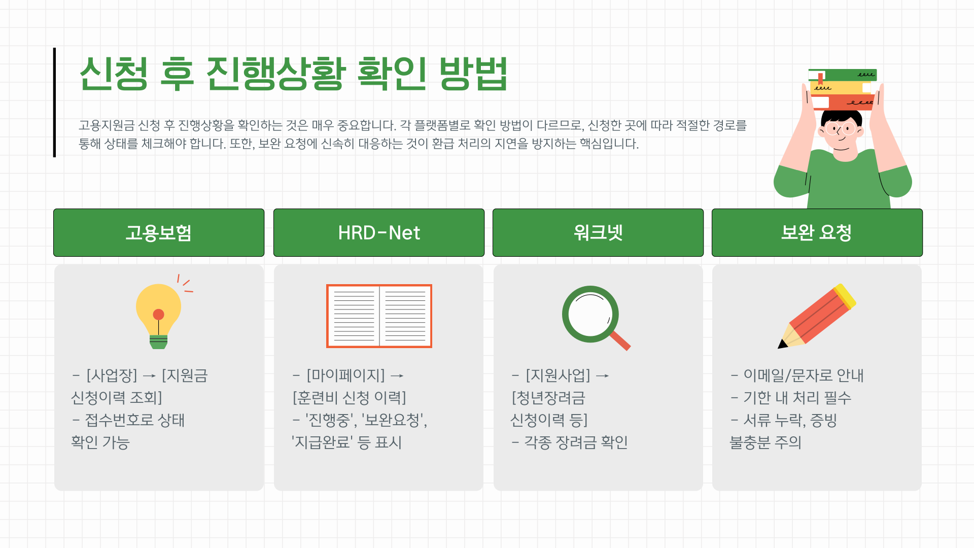 수료증, 출석부, 훈련일지, 수강료 납부 영수증 등은 미리 스캔해 준비하면 빠르게 업로드할 수 있습니다. HRD-Net은 신청 진행 상황을 ‘진행중’, ‘보완요청’, ‘지급완료’ 등으로 실시간 확인할 수 있어 편리합니다.