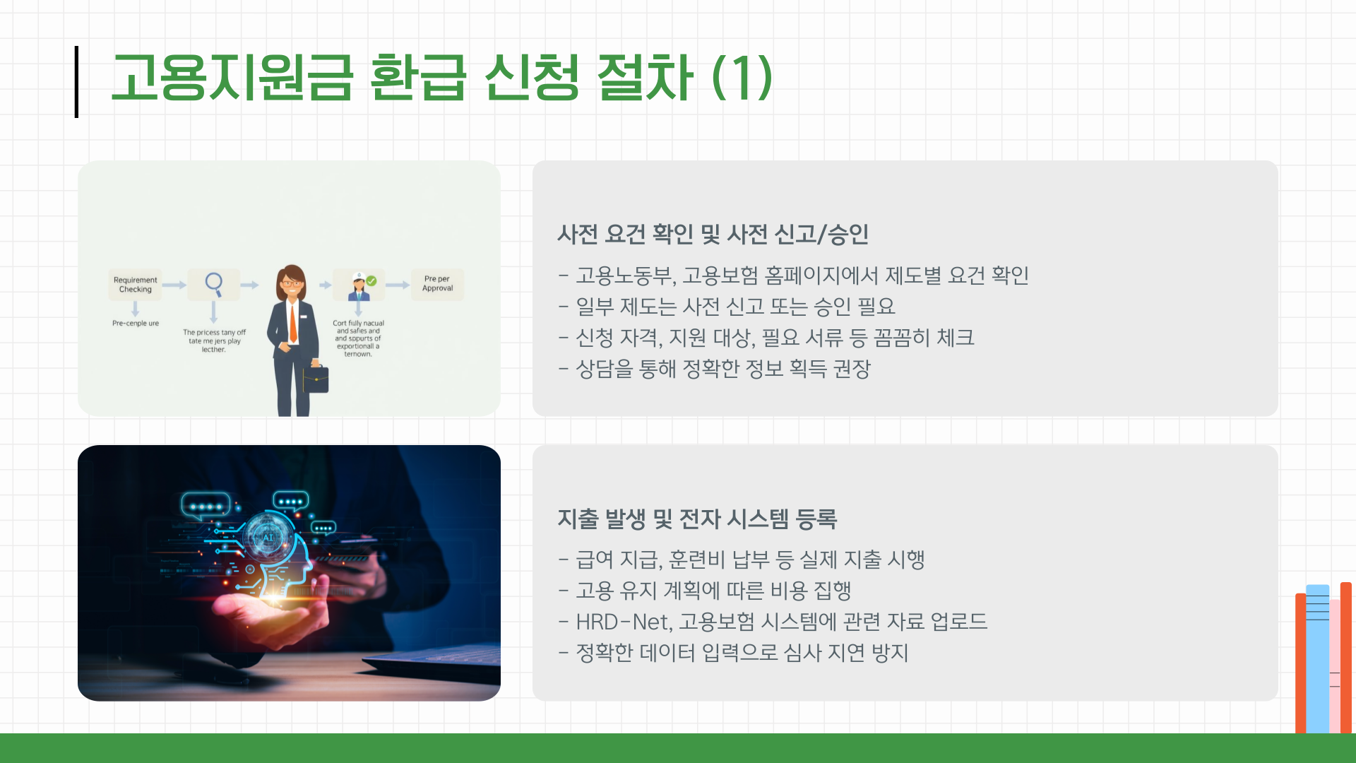 또한 직업훈련비 환급의 경우, 훈련기관에 직접 비용을 지급했는지, 훈련이 NCS 기반인지, HRD-Net에 등록된 과정인지 등에 따라 환급 여부가 결정됩니다. 따라서 모든 고용지원금에는 공통적으로 '선행 조건 확인 → 사전 준비 서류 확보 → 환급 신청'의 순서가 중요합니다.