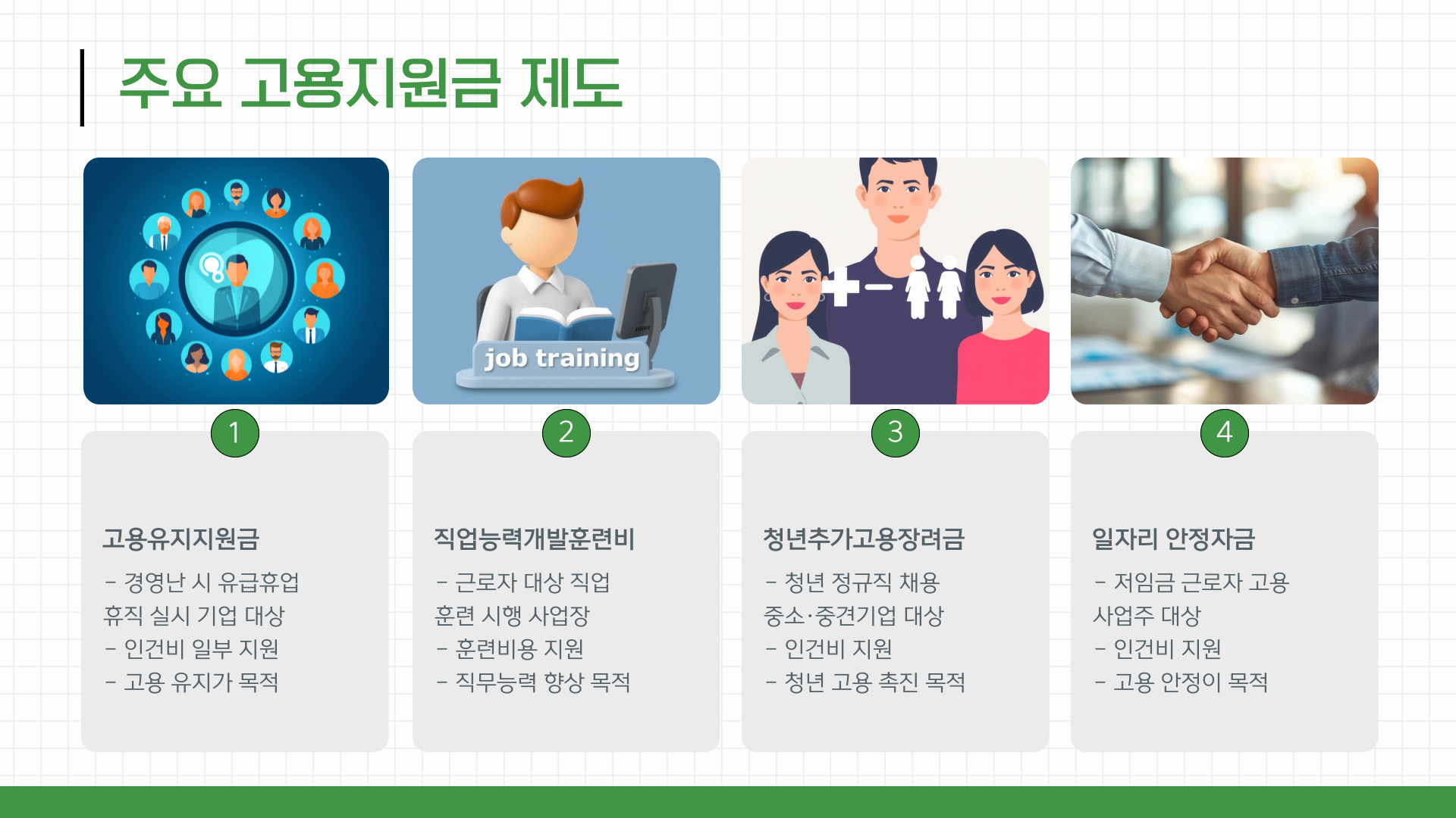 고용지원금 환급 신청을 위해선 먼저 어떤 제도가 현재 자사에 적용될 수 있는지 확인해야 합니다. 주요 제도는 아래와 같습니다.