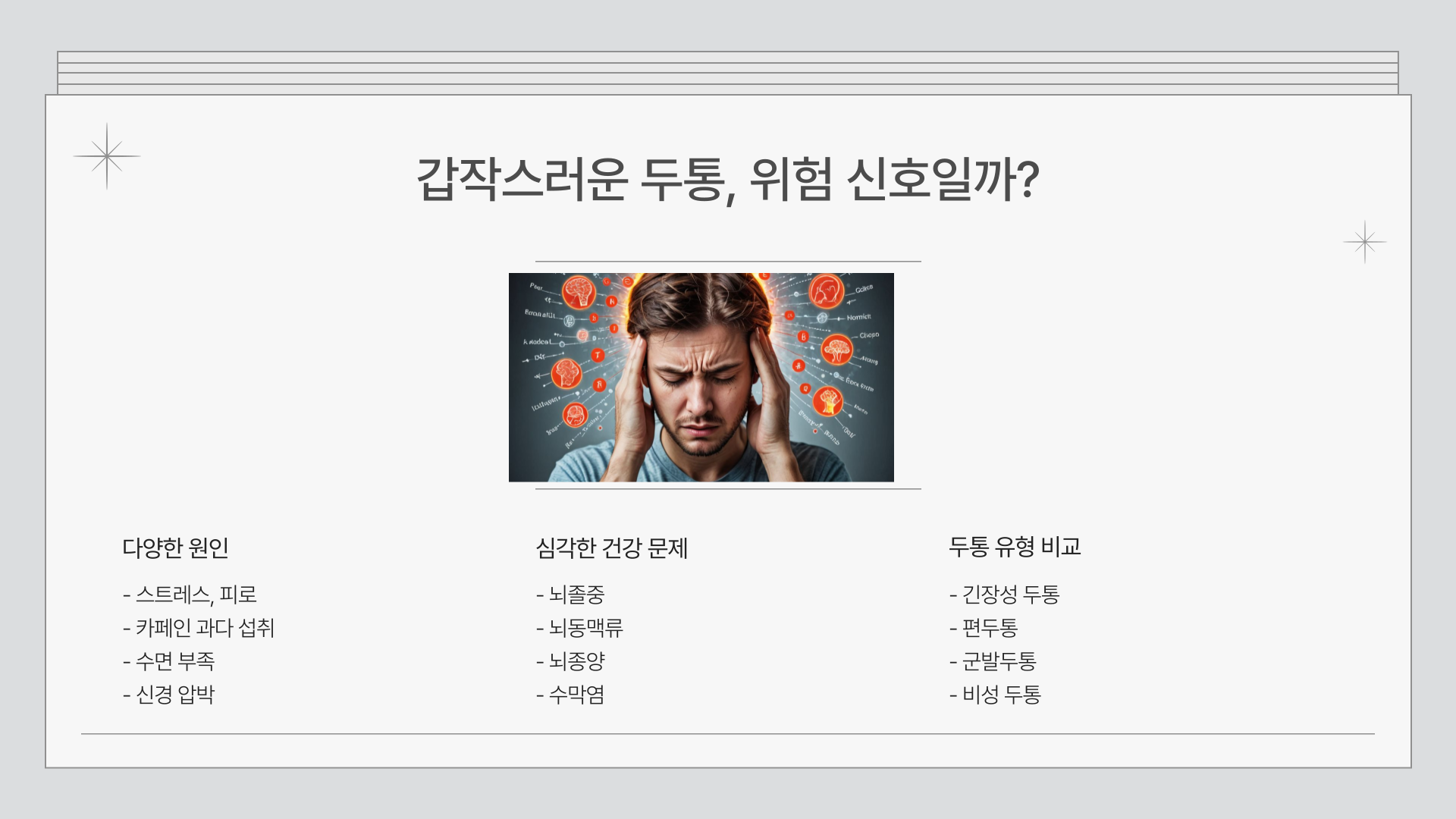 이 외에도 두통이 지속적으로 반복되거나 하루 종일 사라지지 않는다면, 긴장성 두통, 편두통, 군발두통 등의 문제를 의심해 볼 필요가 있습니다. 증상을 정확히 기록하고 의사와 상담하는 것이 중요합니다.