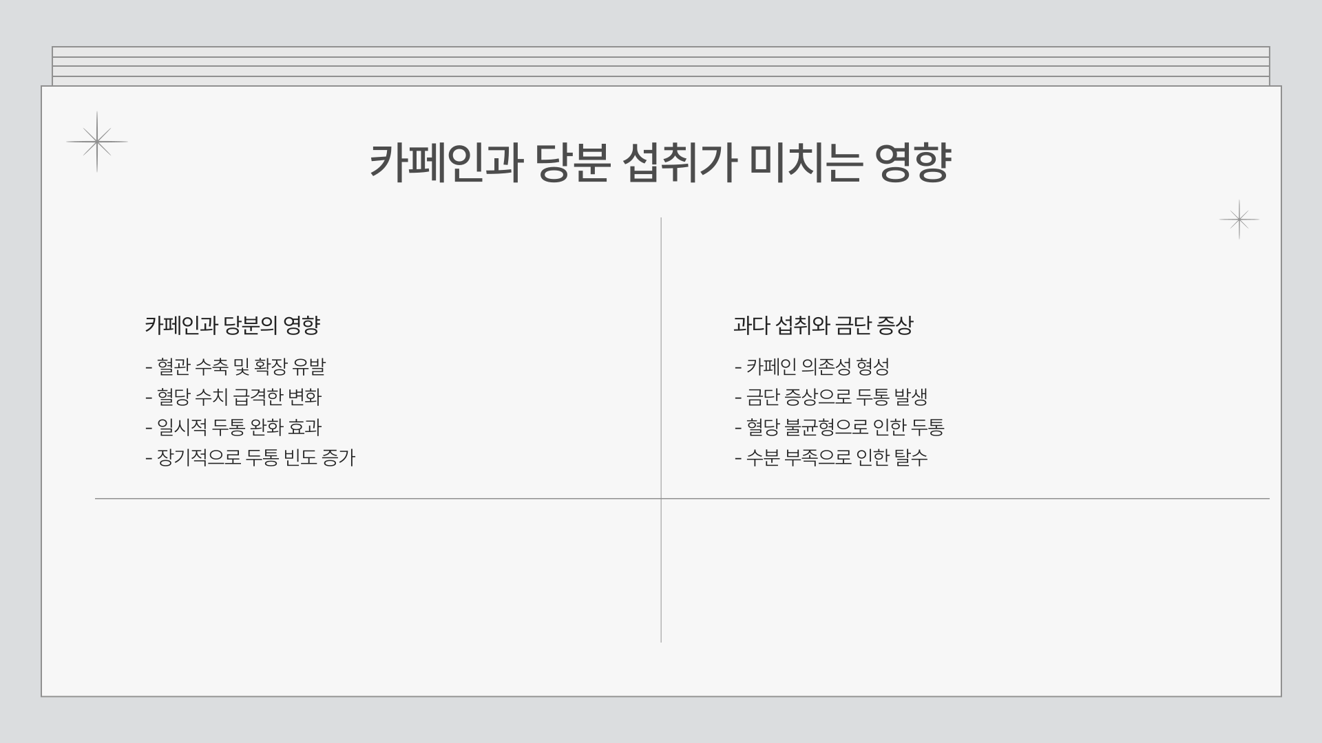 카페인과 당분은 우리 몸에 큰 영향을 미치는 성분입니다. 적절한 섭취는 집중력을 높이고 기분을 좋게 만들지만, 과다 섭취하면 두통을 유발할 수 있습니다.