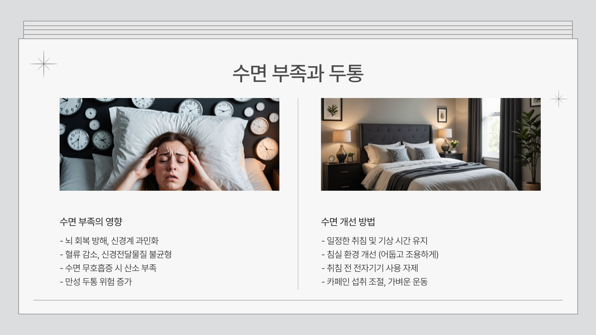 특히, 불규칙한 수면 습관은 뇌의 혈류를 감소시키고, 신경 전달물질의 균형을 무너뜨려 두통을 유발할 수 있습니다. 또한, 수면 무호흡증이 있는 경우 산소 공급이 원활하지 않아 두통이 더욱 심해질 수 있습니다.