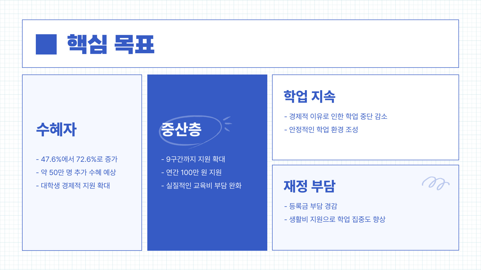 - 중산층 가구도 국가장학금 혜택을 받을 수 있도록 지원 폭 확대