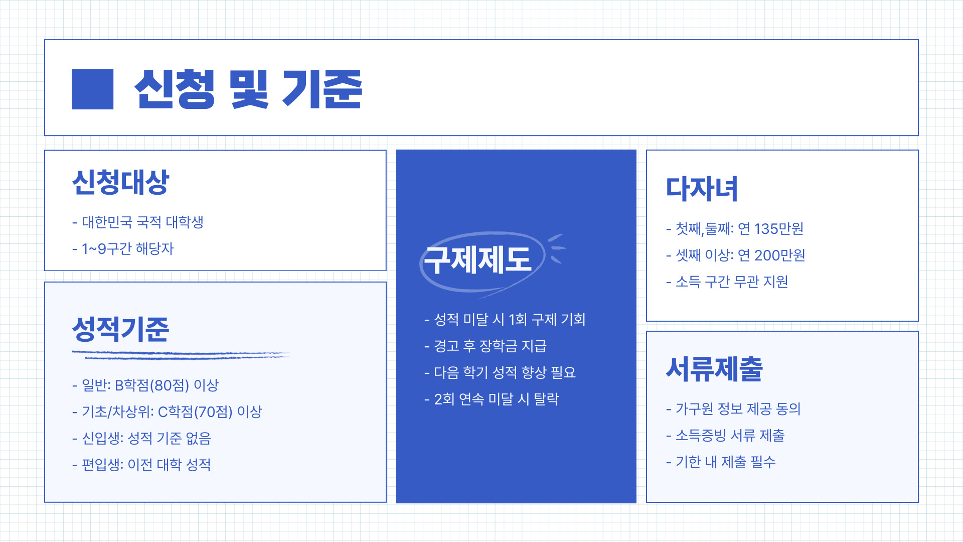- 기초생활수급자 및 차상위 계층: 직전 학기 C학점 이상 (70점 이상)