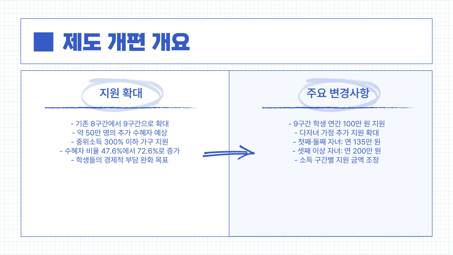 기존에는 소득 8구간까지만 지원되었지만, 이번 개편으로 약 50만 명의 학생이 추가로 혜택을