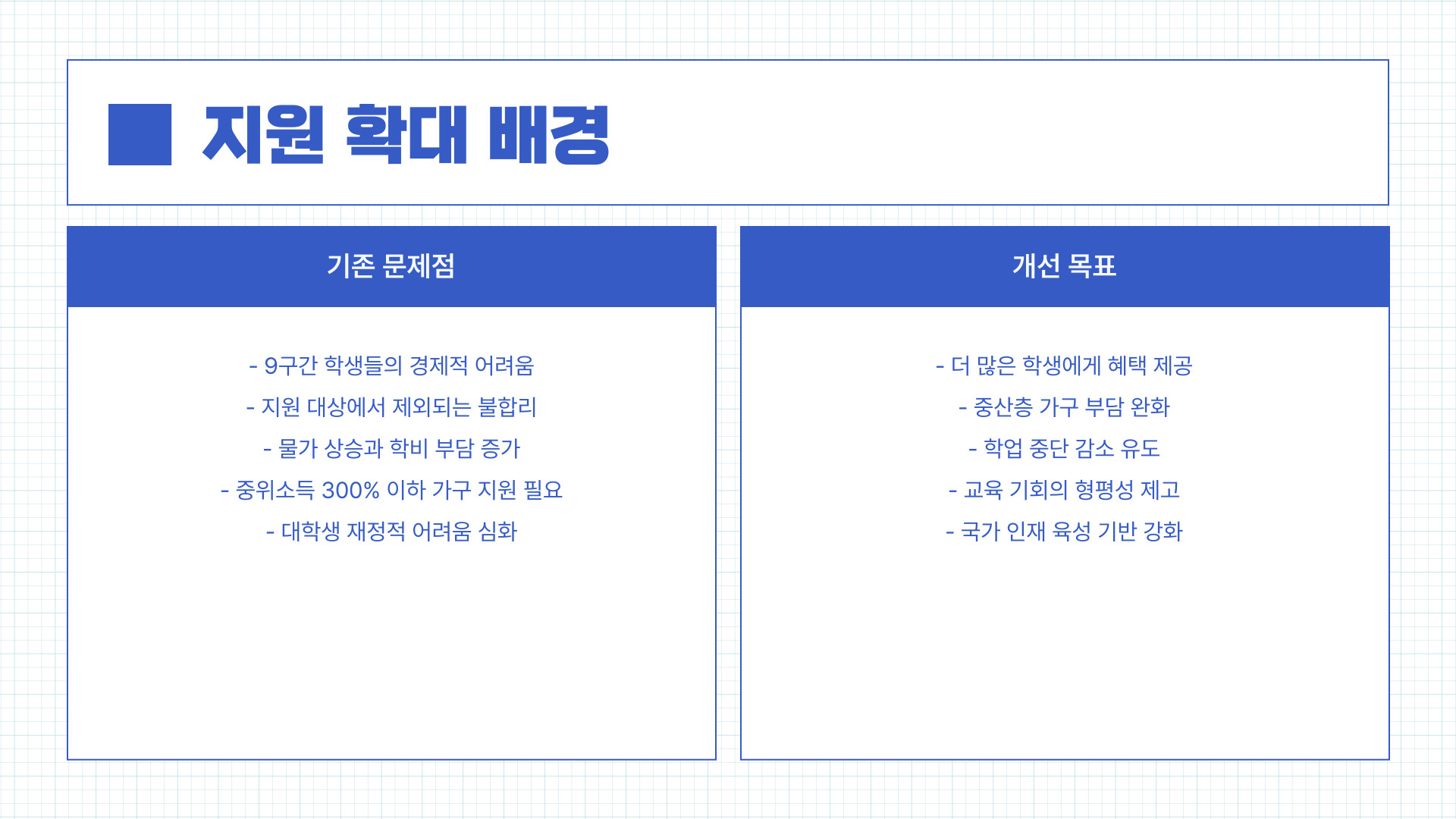 - 9구간 학생들은 경제적으로 어려움이 있음에도 불구하고 지원 대상에서 제외되었어요. - 물가 상승과 학비 부담 증가로 인해 대학생들의 재정적 어려움이 커지고 있었어요. - 중위소득 대비 300% 이하 가구(4인 기준 약 1,829만 원 이하)도 실질적인 지원이 필요했어요.