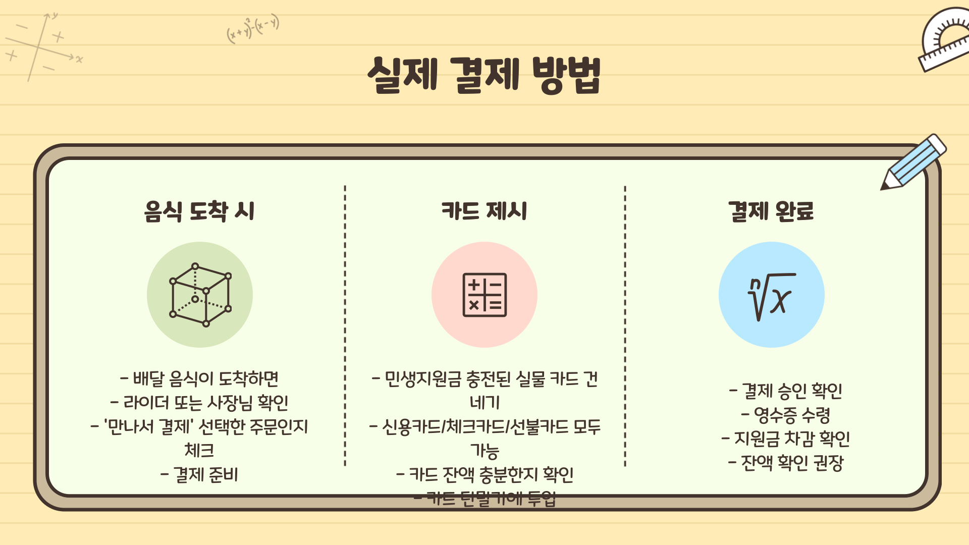 실제 결제는 음식이 도착한 후, 라이더 또는 가게 사장님에게 실물 카드를 건네고, 가게의 카드 단말기에서 결제하는 방식이에요. 이때 사용하는 카드는 정부에서 지급한 신용카드, 체크카드, 선불카드</strong 등 민생지원금이 충전된 카드여야 해요.
