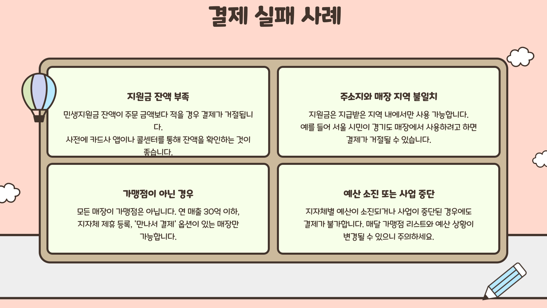 결제 시 오류가 발생하는 경우도 있어요. 예를 들어 지원금 잔액이 부족하거나, 주소지와 매장의 지역이 일치하지 않거나, 가맹점이 아닌 곳일 경우 모두 결제가 거절돼요.