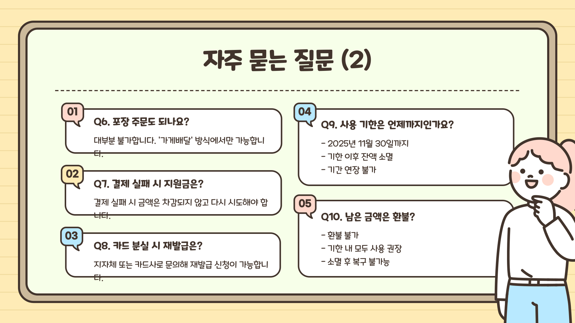 A8. 지자체 또는 카드사로 문의해 재발급 신청이 가능해요.