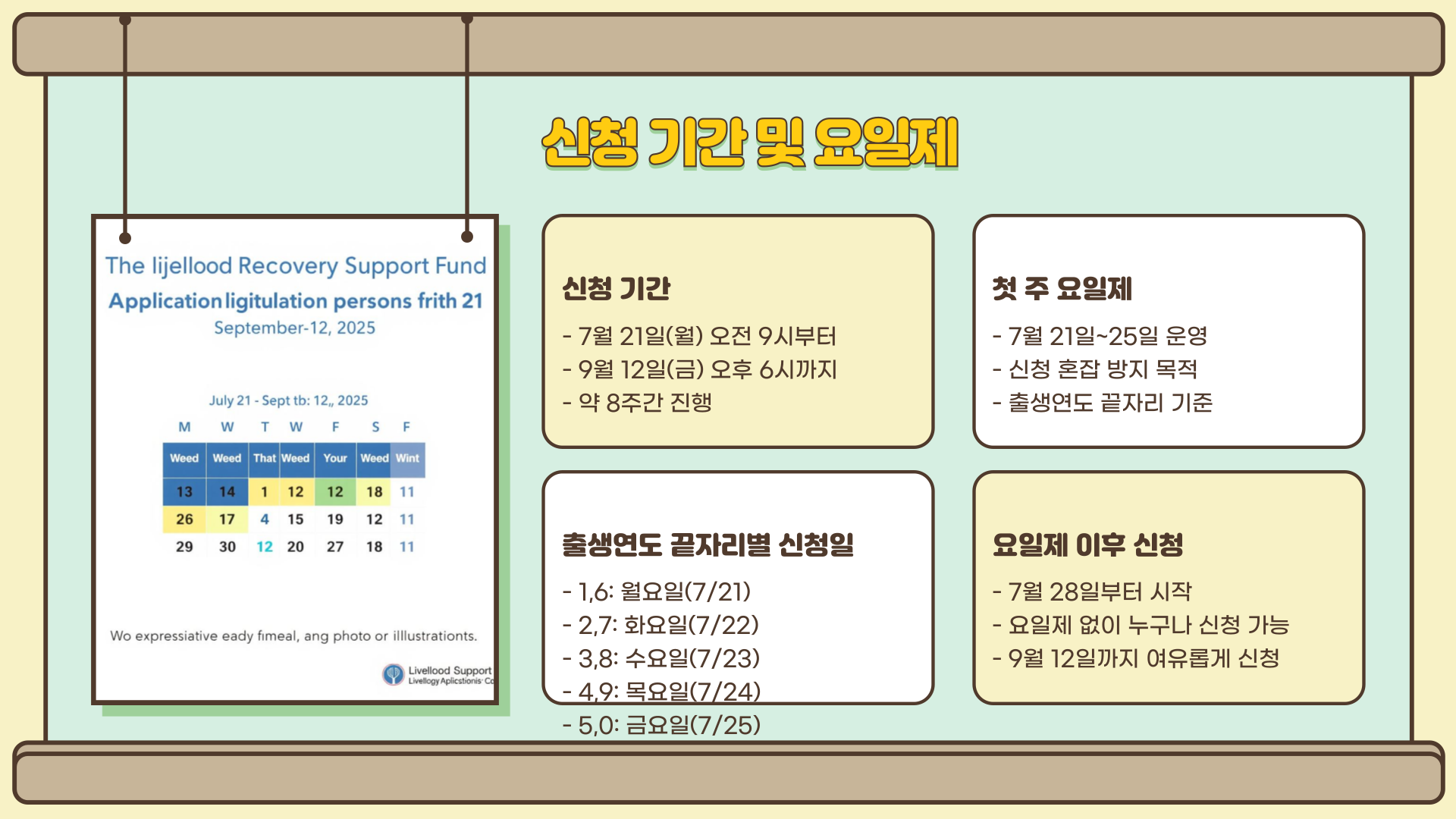 2025년 민생회복지원금 신청은 7월 21일(월) 오전 9시부터 9월 12일(금) 오후 6시까지 가능해요. 약 8주간 진행되니, 기간 내에만 잘 챙기면 누구나 받을 수 있답니다.