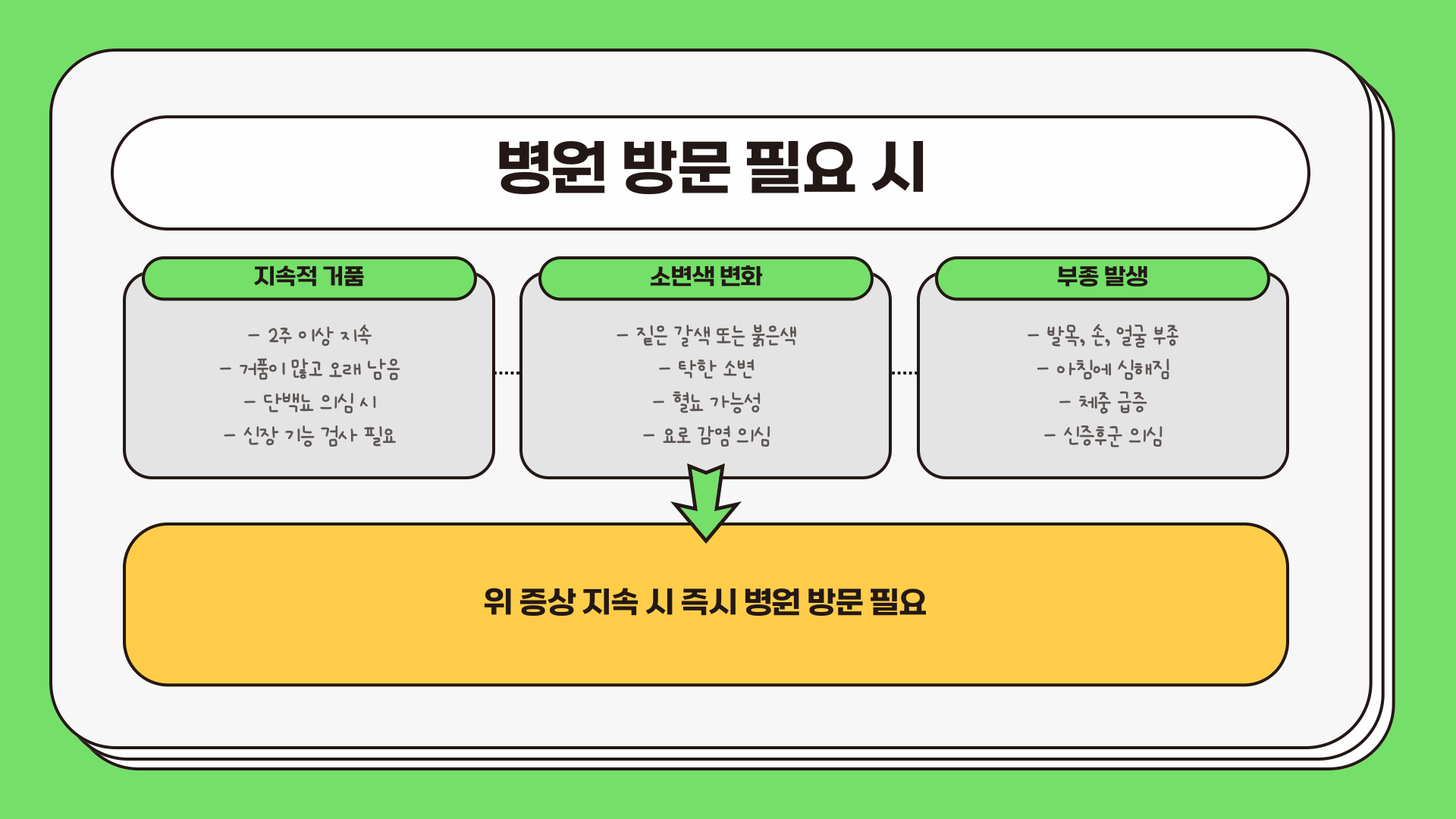 | 소변 색 | 맑고 연한 노란색 | 탁하거나 짙은 색 |