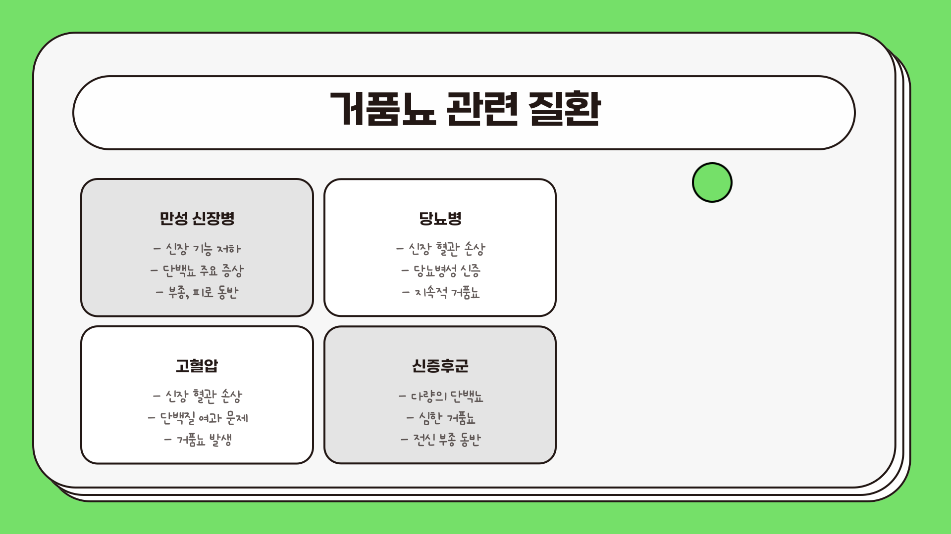 만성 신장병은 신장의 기능이 점진적으로 저하되는 질환이에요. 단백뇨가 주요 증상 중 하나이며, 소변에 지속적인 거품이 발생할 수 있어요. 부종, 피로, 혈압 상승도 동반될 수 있어요.