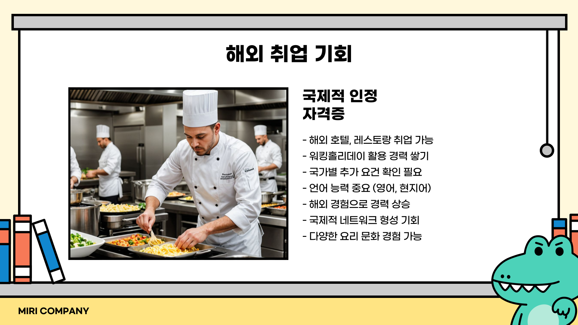 특히 프렌치, 이탈리안, 아메리칸 스타일 요리를 배우고 싶다면 반드시 도전해 볼 만한 자격증이에요!