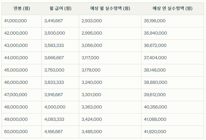 2. 예상 월 실수령액은 국민연금, 건강보험, 고용보험, 소득세, 지방소득세 등을 공제한 후의 금액입니다.