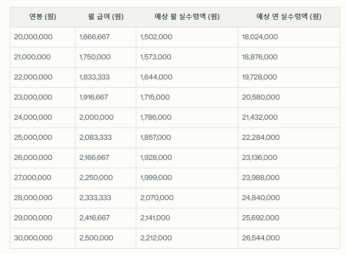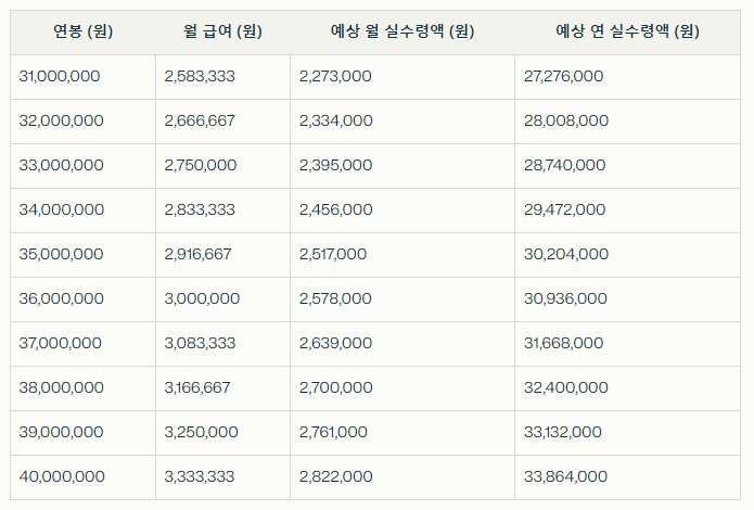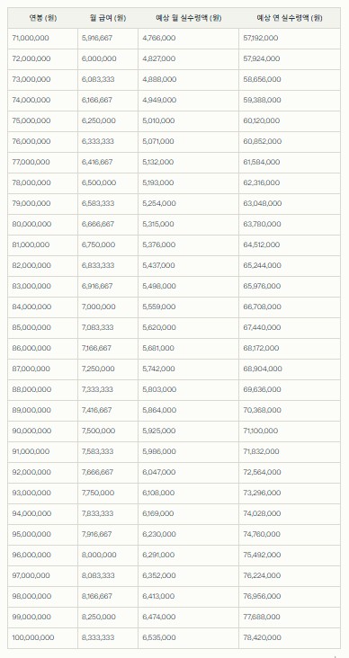 연봉별 예상 실수령액 계산