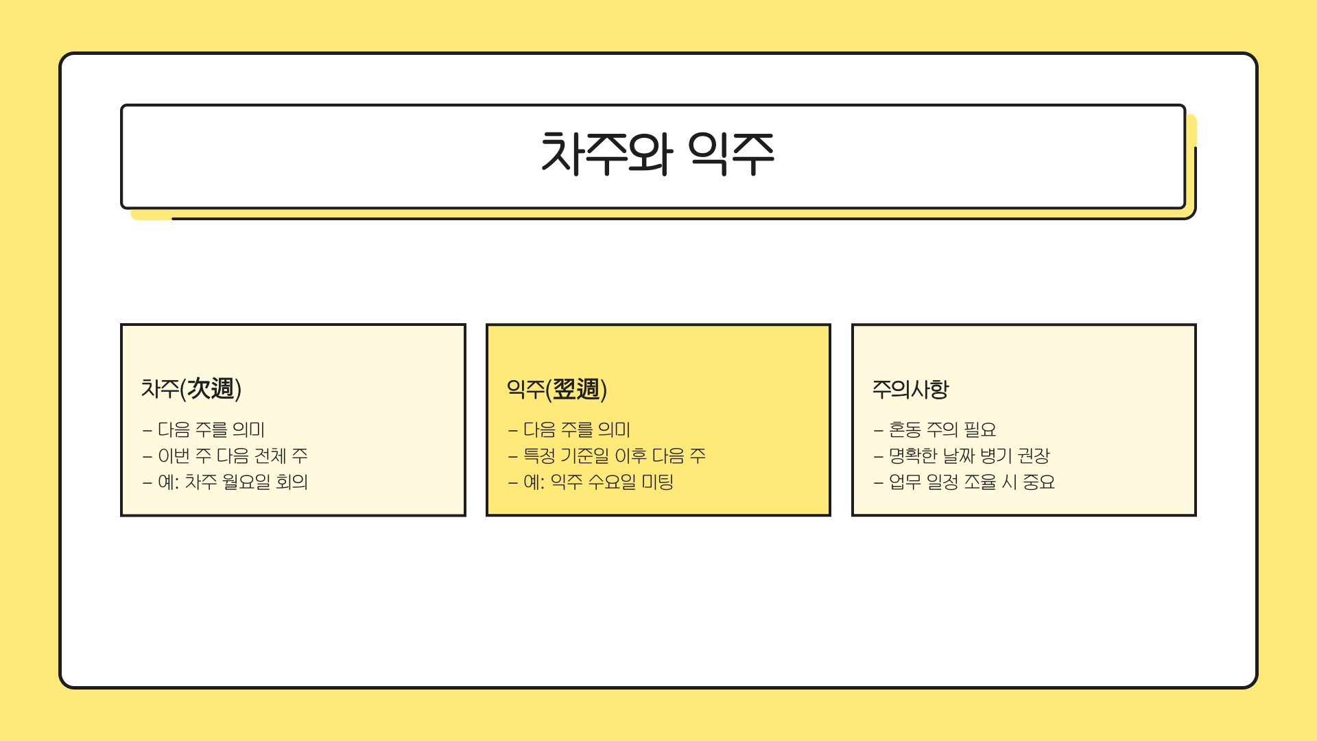 ‘차주’와 ‘익주’는 보통 월요일을 기준으로 사용합니다. 일정 공유 시 상대방과 인식 차이가 없도록 주의해야 합니다.