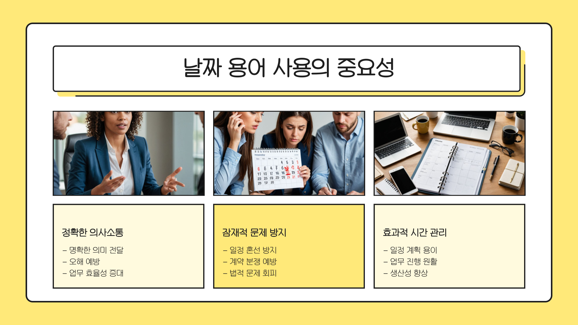 업무에서 날짜 관련 용어를 정확하게 사용하지 않으면 일정이 꼬이거나 중요한 약속을 놓칠 수 있습니다. 특히 보고서, 공문서, 이메일에서 날짜를 명확하게 표현하는 것이 중요합니다.