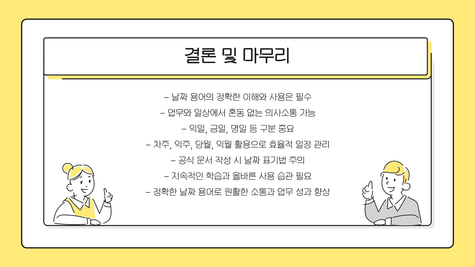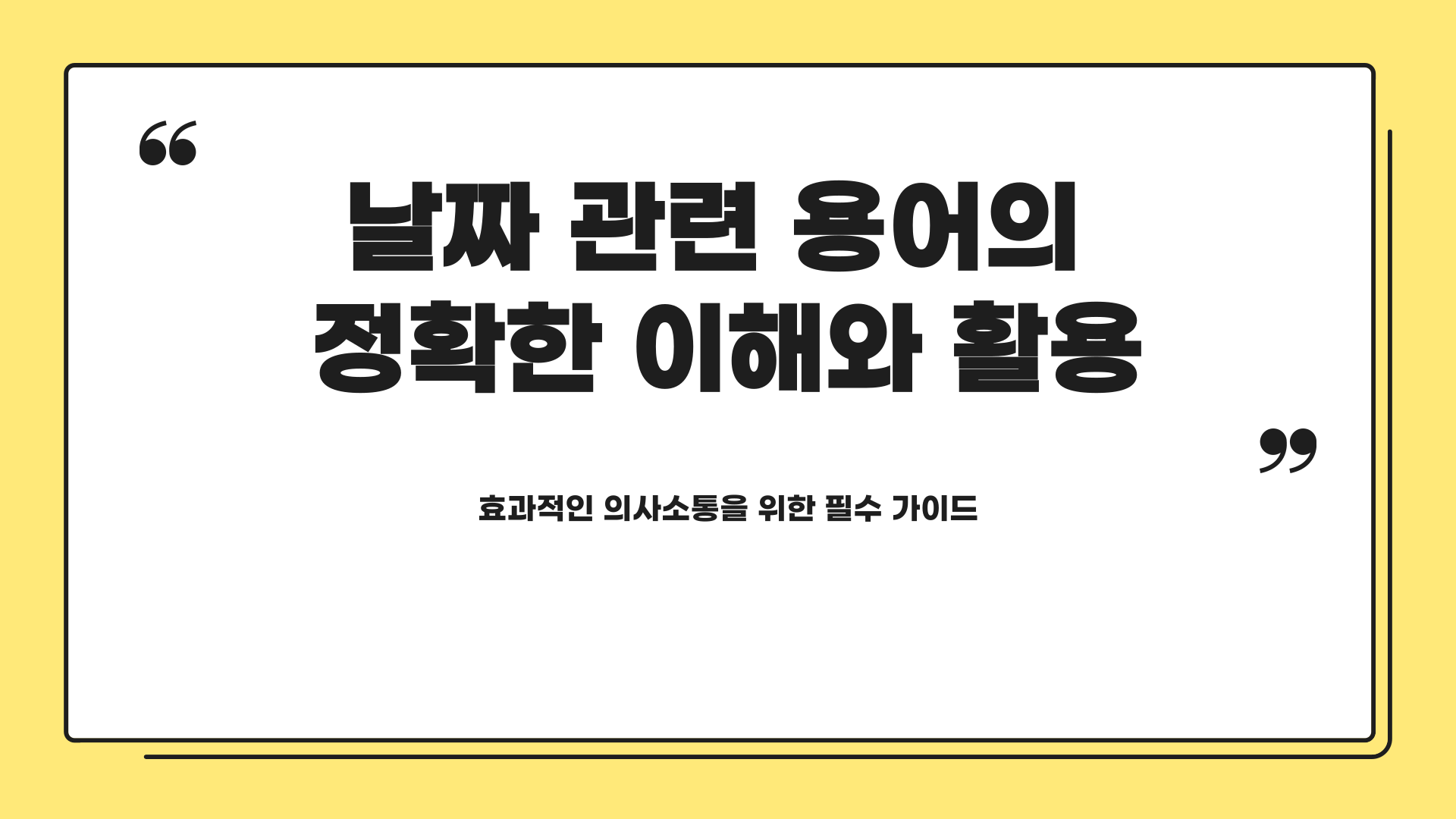 시간 관리는 효과적인 일정 조율과 직결됩니다. 날짜 관련 용어를 정확하게 사용하면 일정이 꼬이는 일을 줄이고, 효율적으로 업무를 진행할 수 있습니다.