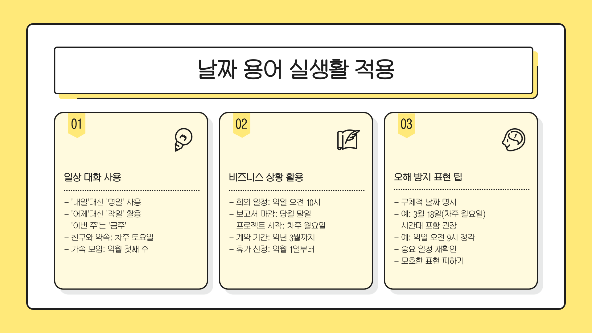 이처럼 날짜 용어를 명확히 사용하면 오해를 방지할 수 있습니다. 특히 중요한 계약이나 일정 조정 시에는 숫자를 함께 표기하는 것이 좋습니다.