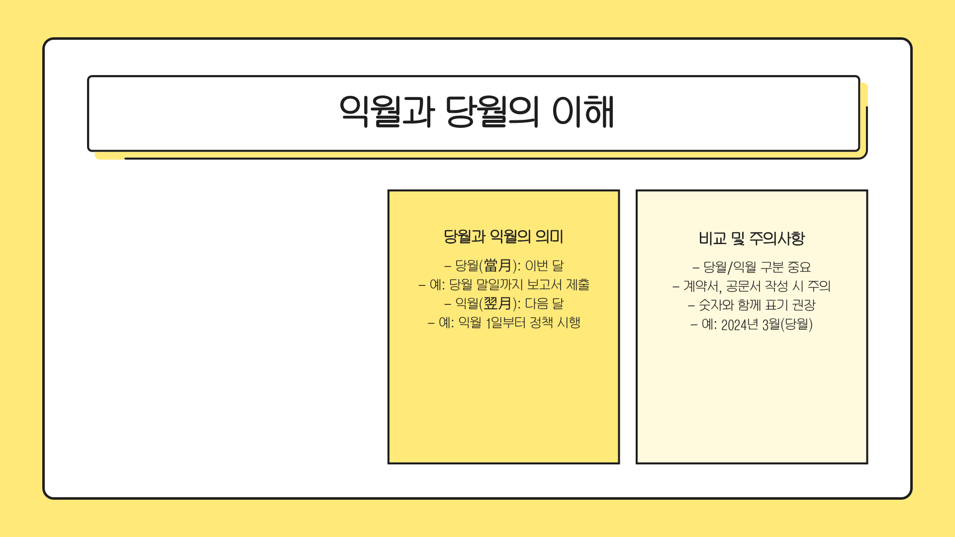 ‘익월’과 ‘당월’은 월 단위로 일정을 정할 때 자주 사용됩니다. 특히 계약서, 공문서, 기업 보고서 등에서 많이 보이는 표현입니다. 두 단어의 정확한 뜻을 알아보고 어떻게 활용하면 좋을지 살펴보겠습니다.