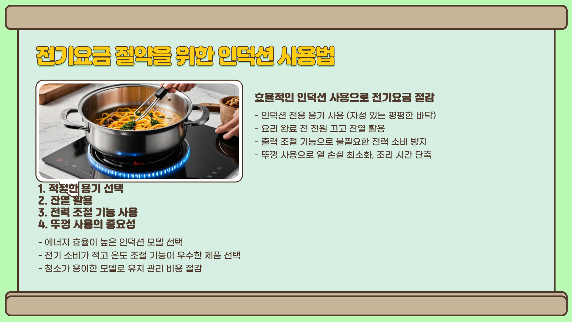 Q2. 인덕션을 사용할 때 전기요금을 줄이는 가장 효과적인 방법은 무엇인가요?