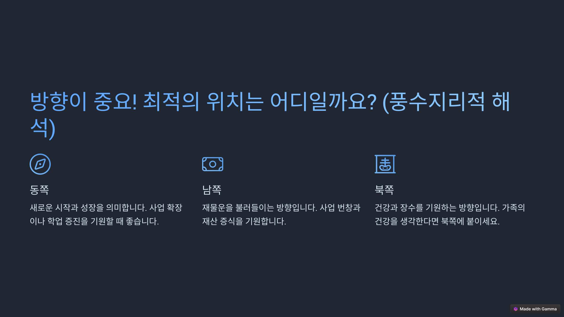| 현관문 | 실내로 들어오는 기운을 좋게 하기 위한 위치 |