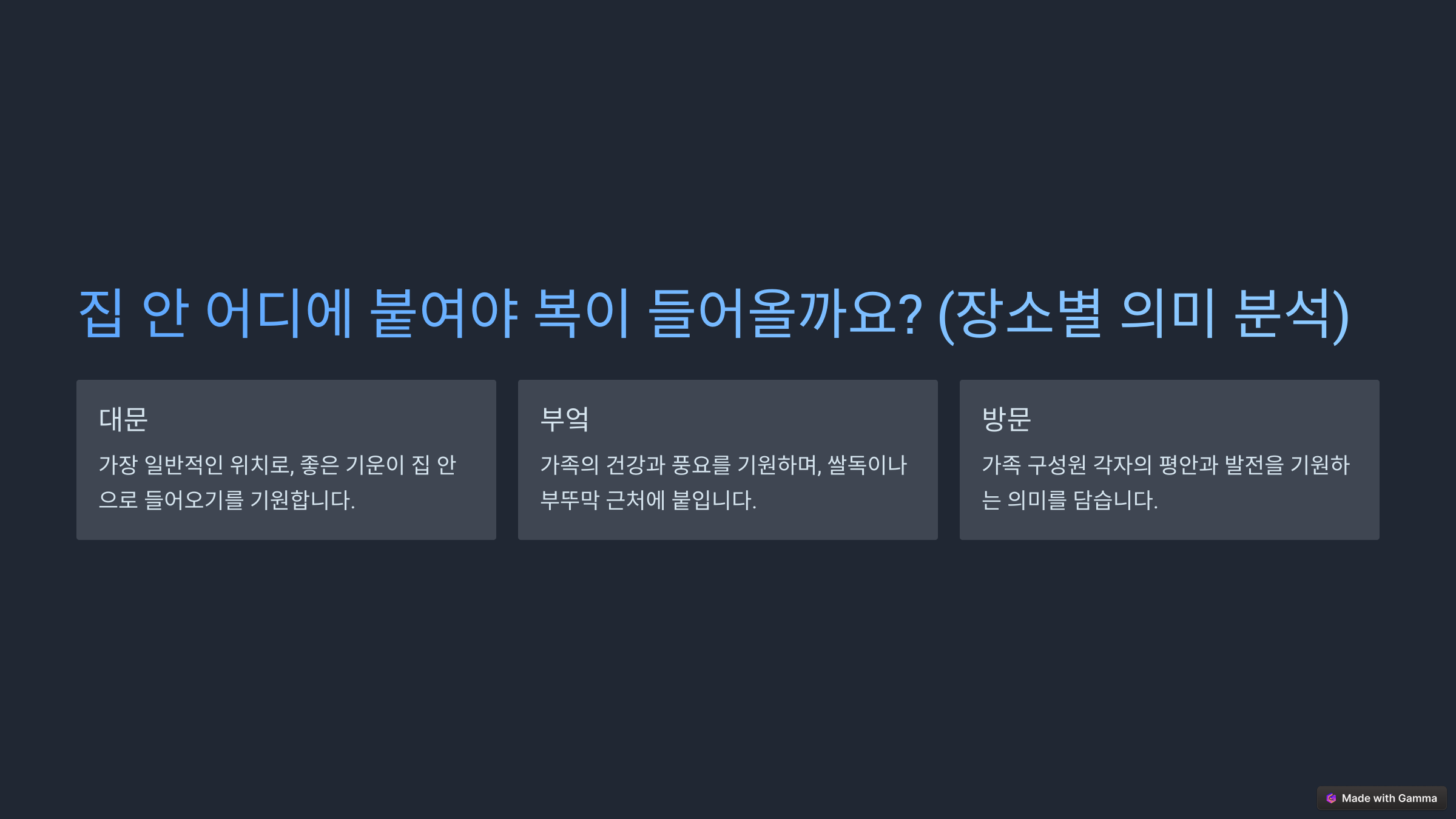 | 대문 | 집 전체의 복을 불러들이는 가장 중요한 장소 |