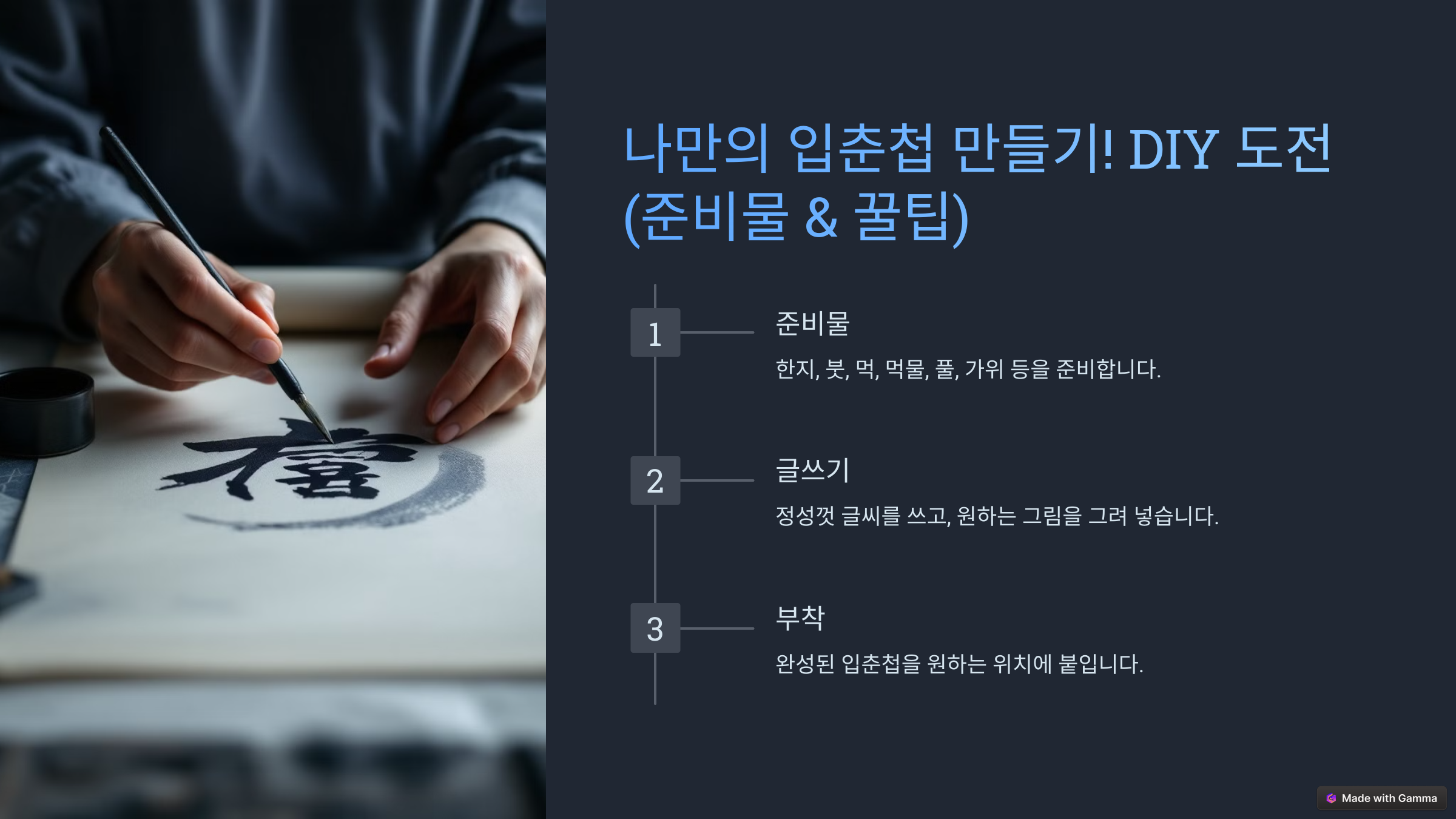 먼저, 한지를 준비해요. 전통적으로 붉은색 한지를 많이 쓰는데, 이는 길운을 상징하기 때문이에요. 검정 먹물이나 붓펜으로 '입춘대길'과 '건양다경'을 써요. 만약 한자가 어렵다면 한글로 써도 괜찮아요!