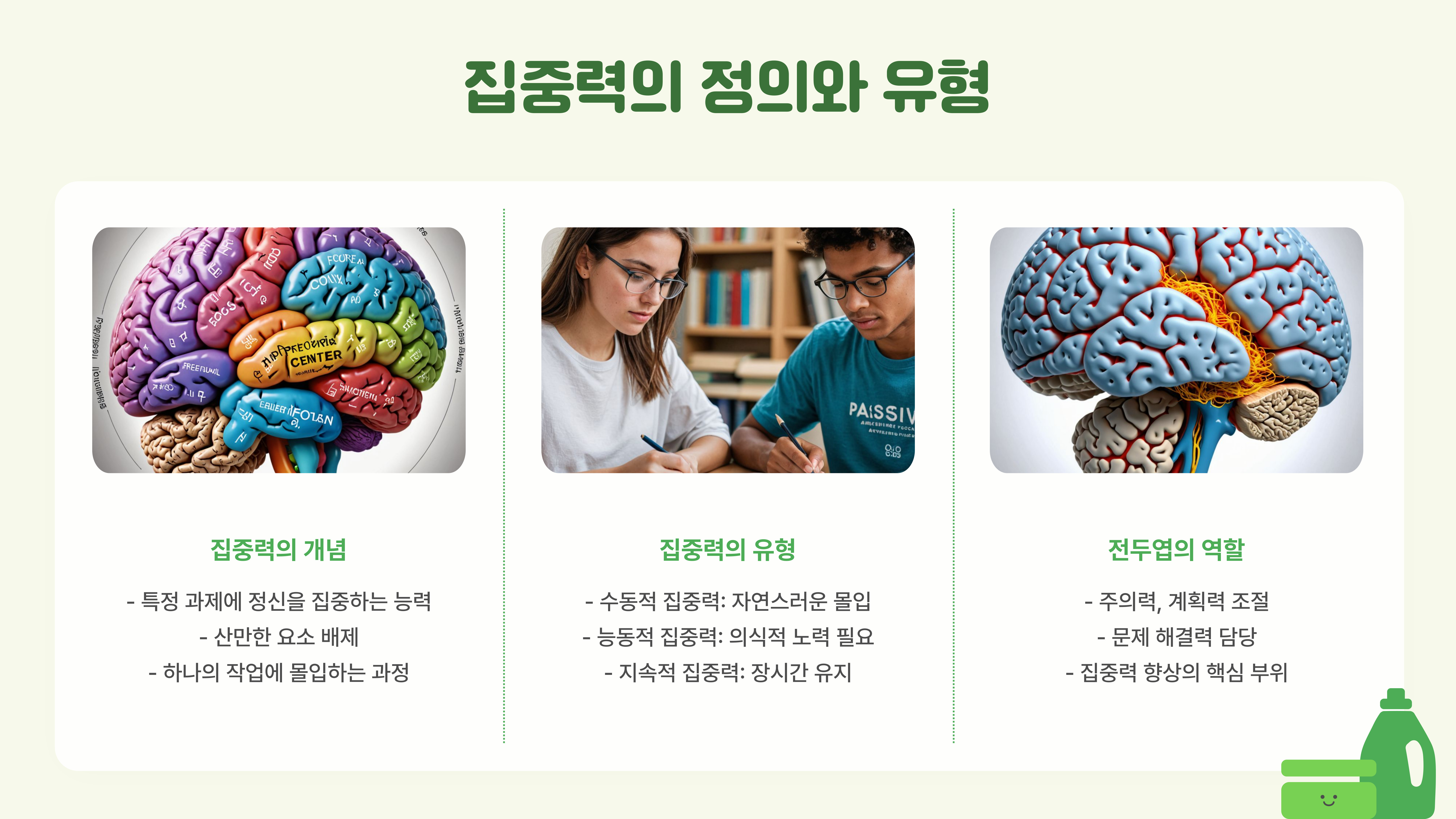 | 능동적 집중력 | 의식적으로 노력해야 하는 집중력 | 시험 공부, 업무 수행 |