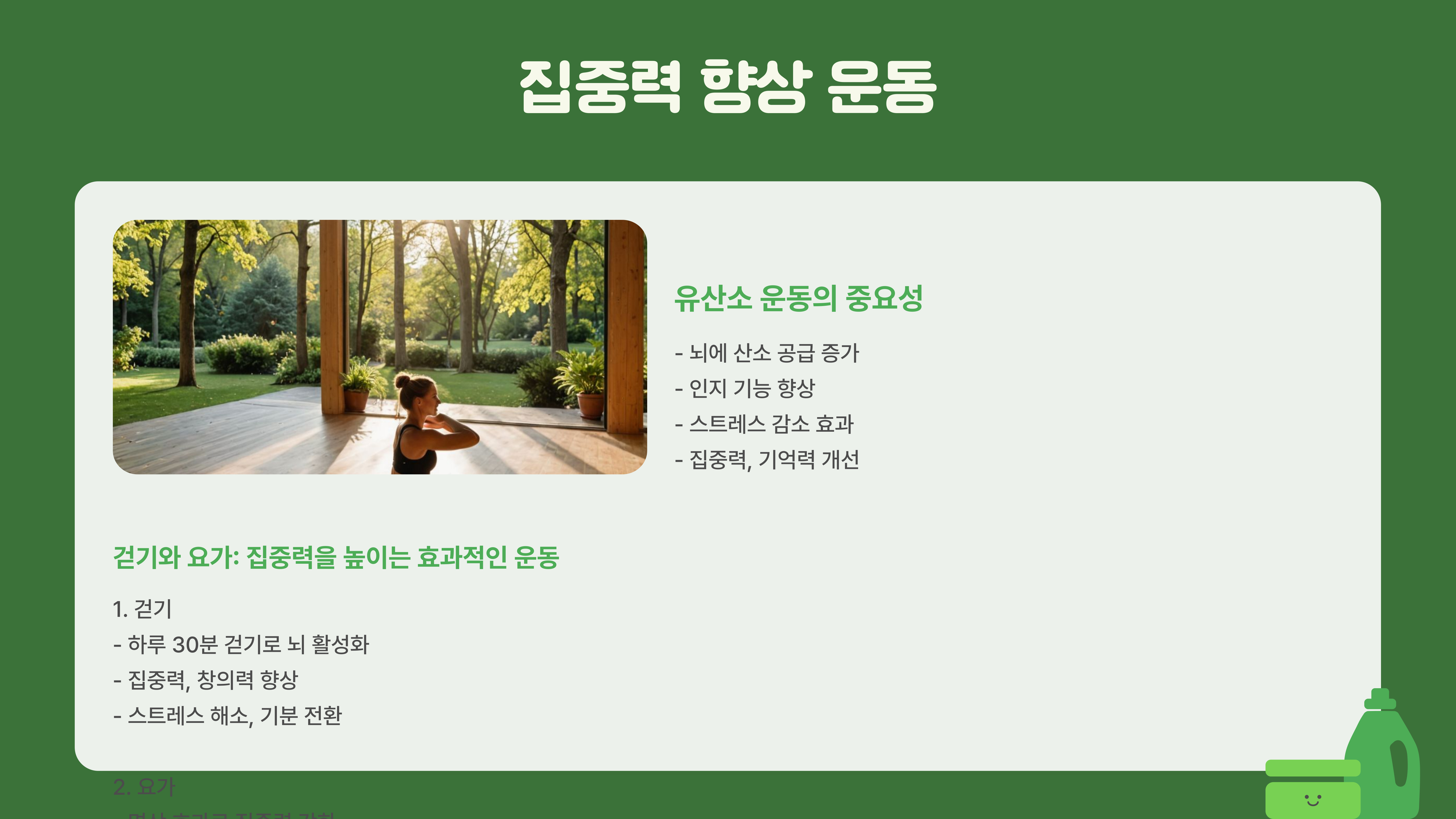 음식뿐만 아니라 운동도 집중력을 키우는 데 중요한 역할을 해요. 특히, 유산소 운동은 뇌에 산소를 공급해 사고력과 기억력을 향상하는 데 효과적이에요.