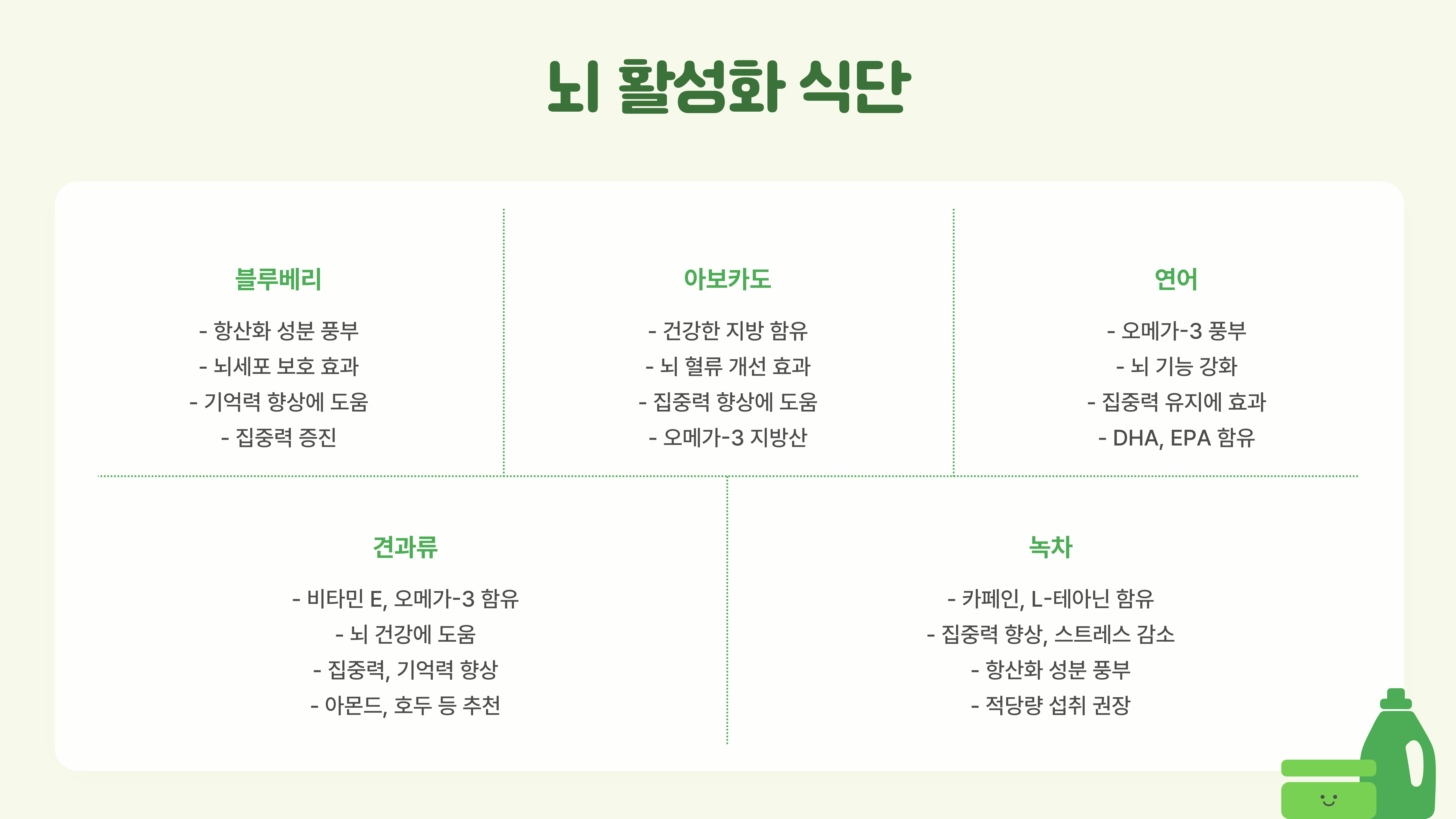 🫐 블루베리: 항산화 성분이 풍부해 뇌세포를 보호하고 기억력을 향상해요.