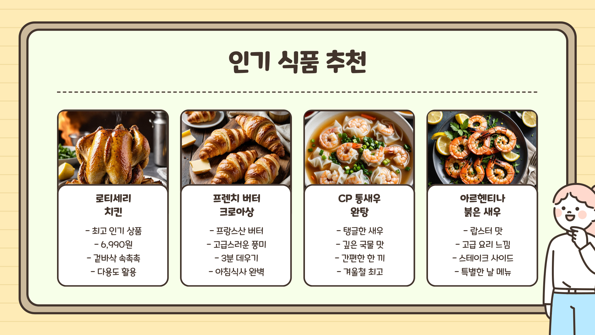 | 로티세리 치킨 | 부드러운 육질, 완전 조리 | 샐러드, 볶음밥, 샌드위치 |
