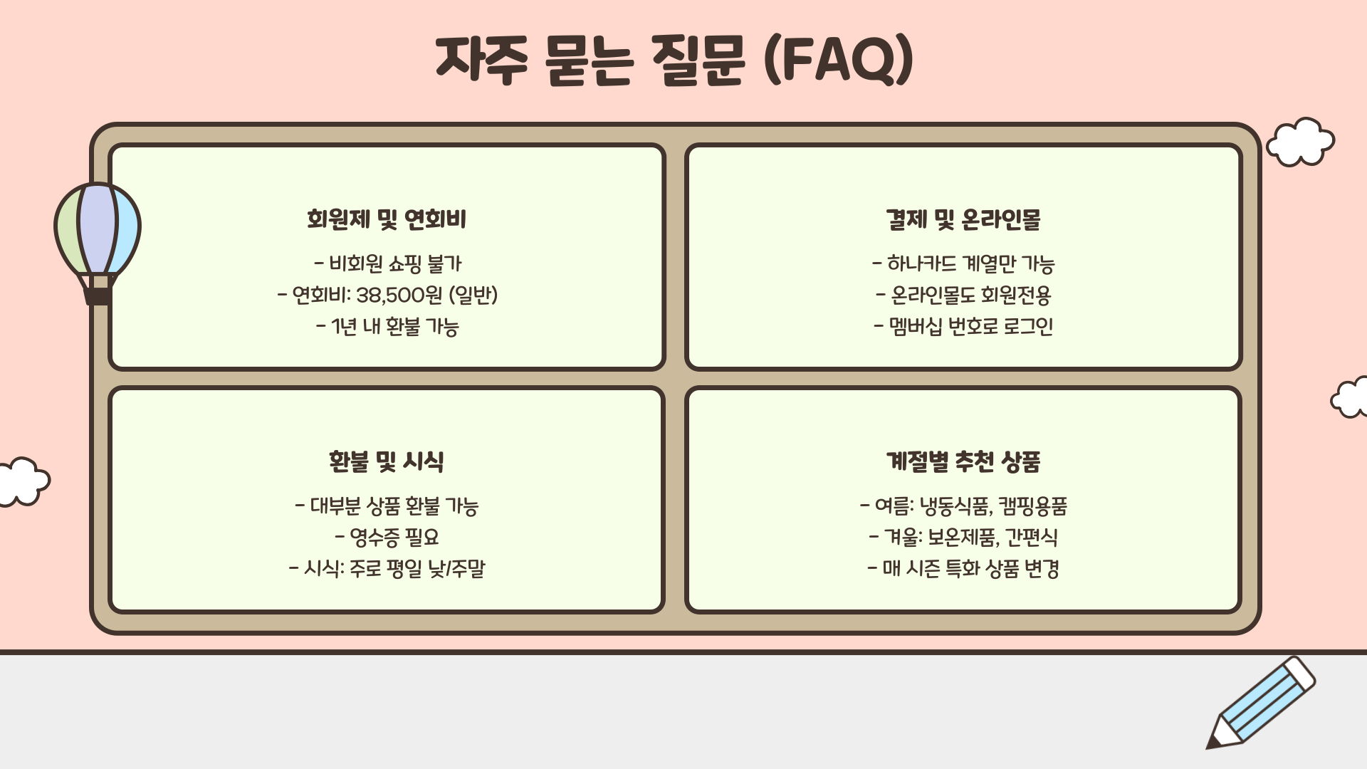 A8. 맞아요! 계절마다 특화된 식품, 생활용품, 캠핑용품, 제철 간식 등이 바뀌어요. 여름엔 냉동식품이나 캠핑용품이, 겨울엔 보온제품과 간편식이 강세를 보여요. 시즌마다 둘러보는 재미도 쏠쏠하죠.