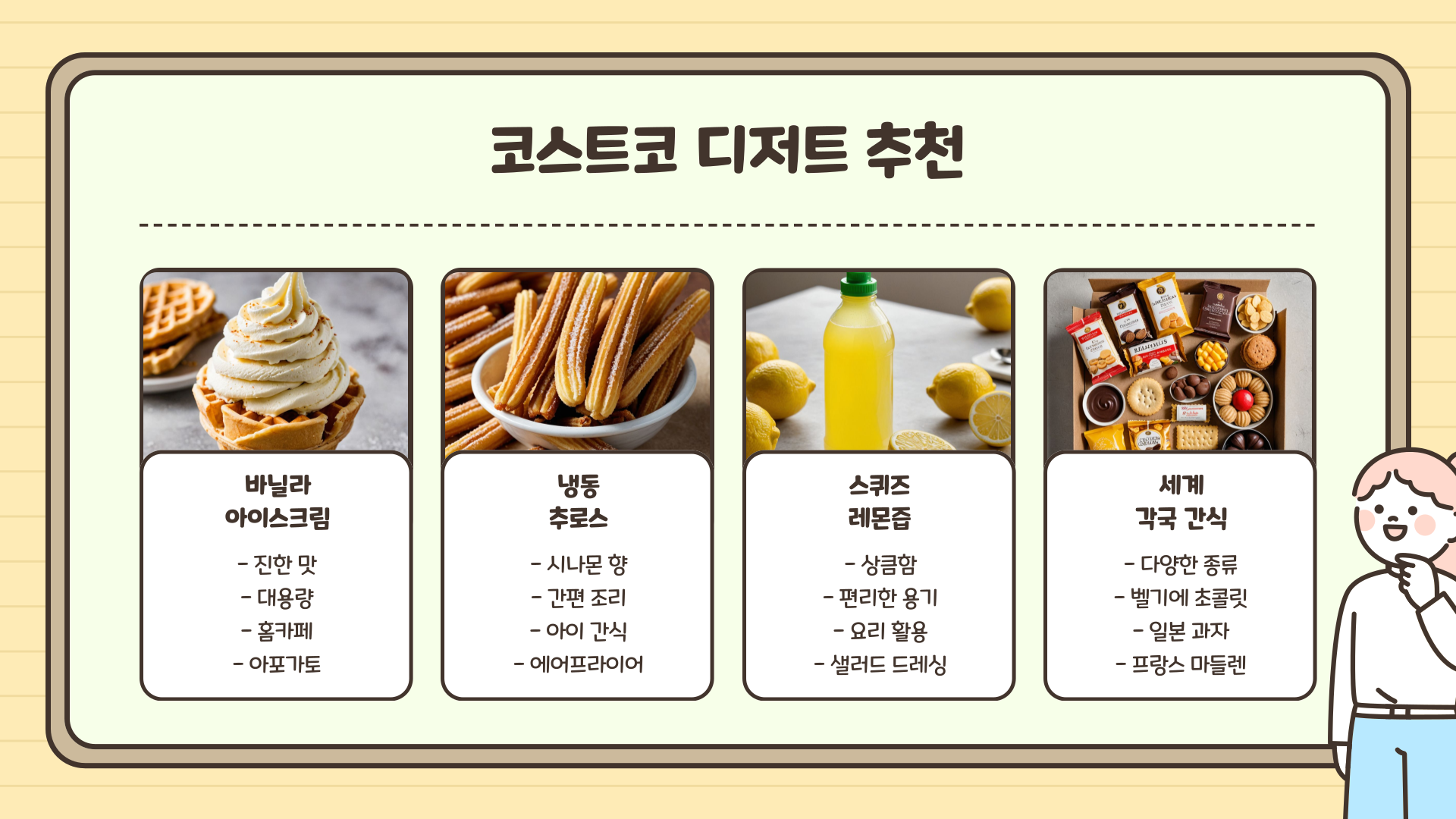 간식을 고를 때는 아이들과 함께 먹을 수 있는 건강 간식인지, 간편하게 조리 가능한지 등을 기준으로 체크해 보면 좋아요. 코스트코는 그런 부분을 고려한 제품들이 많아서 선택이 수월해요.