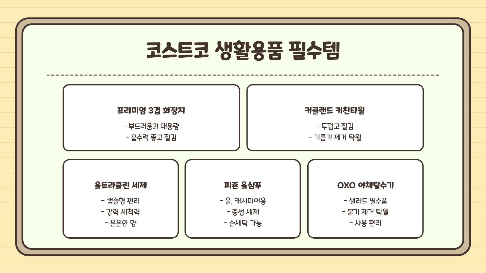 코스트코의 생활용품 코너는 실용성과 가성비를 모두 챙기려는 사람들에게 인기 많은 공간이에요. 특히 커클랜드 시그니처 제품들은 품질이 높으면서도 가격이 착해서 정기적으로 사는 사람들이 정말 많아요.