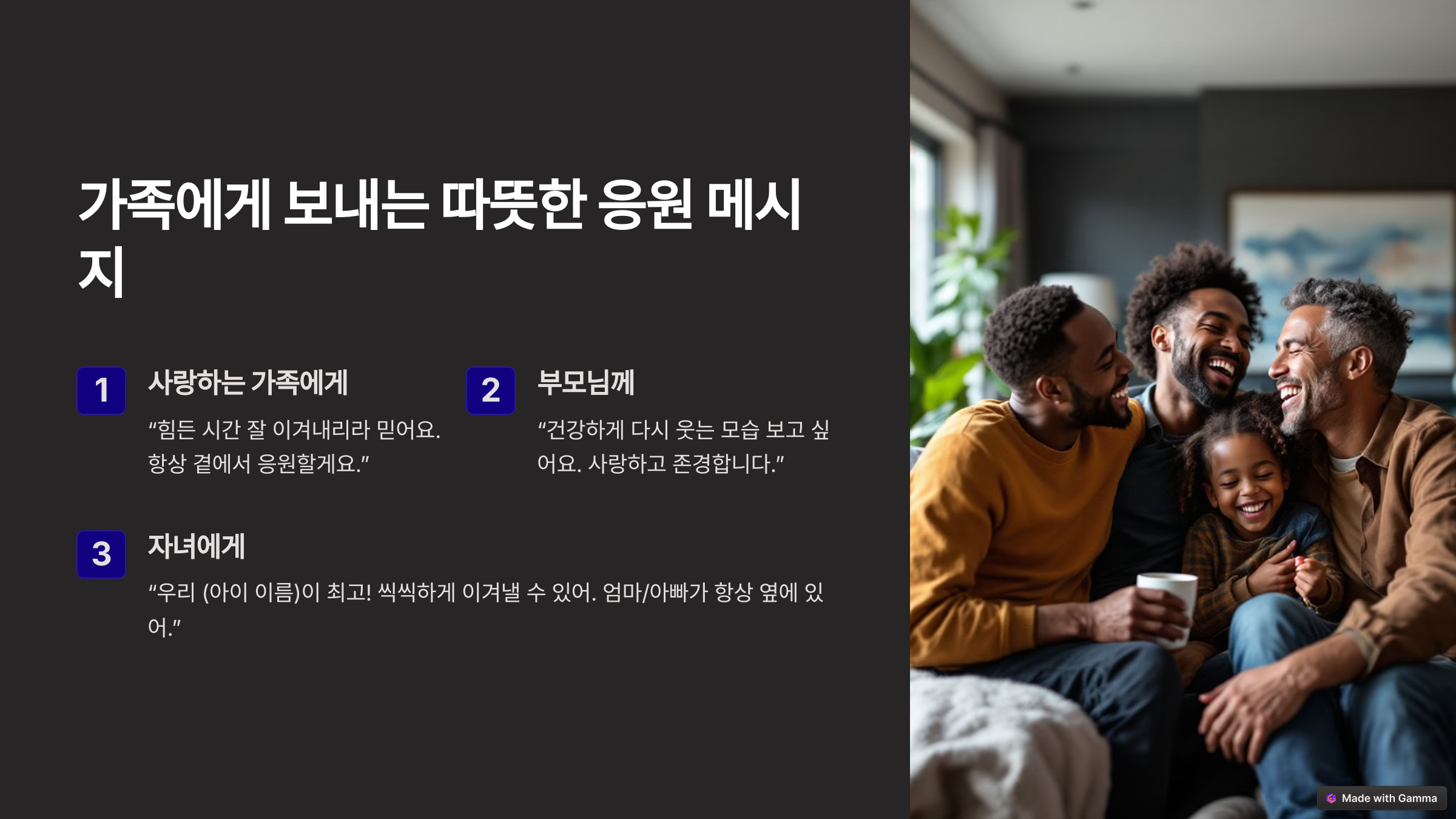 ✔️ "우리 가족은 늘 함께해! 💪 힘든 순간이지만, 우리 모두 널 응원하고 있어. 얼른 건강해져서 함께 웃자!"