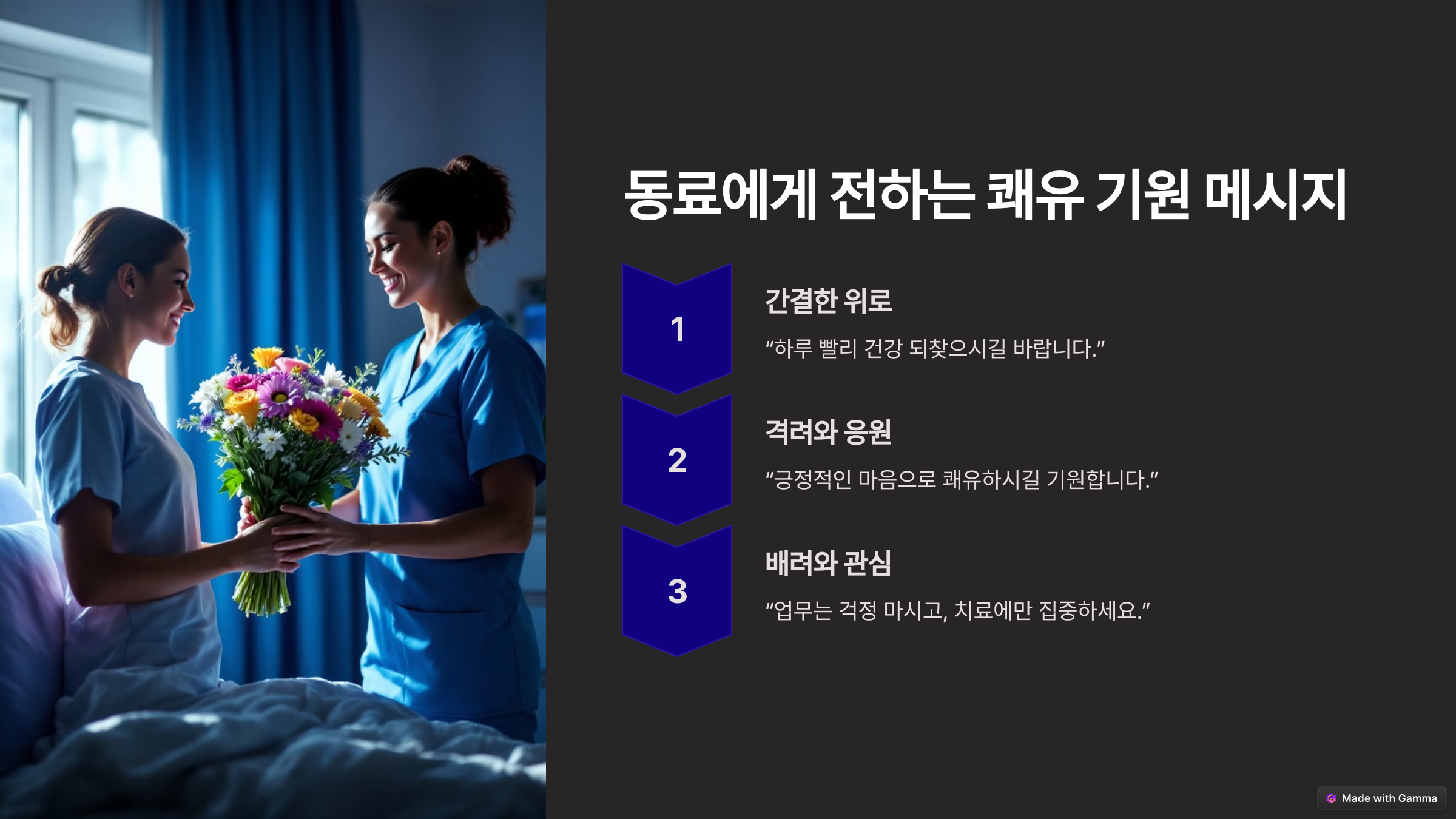 | 퇴원 후 복귀하는 동료 | "다시 뵙게 되어 반갑습니다! 건강이 최우선이니 무리하지 마시고 차근차근 일하시길 바랍니다!" |