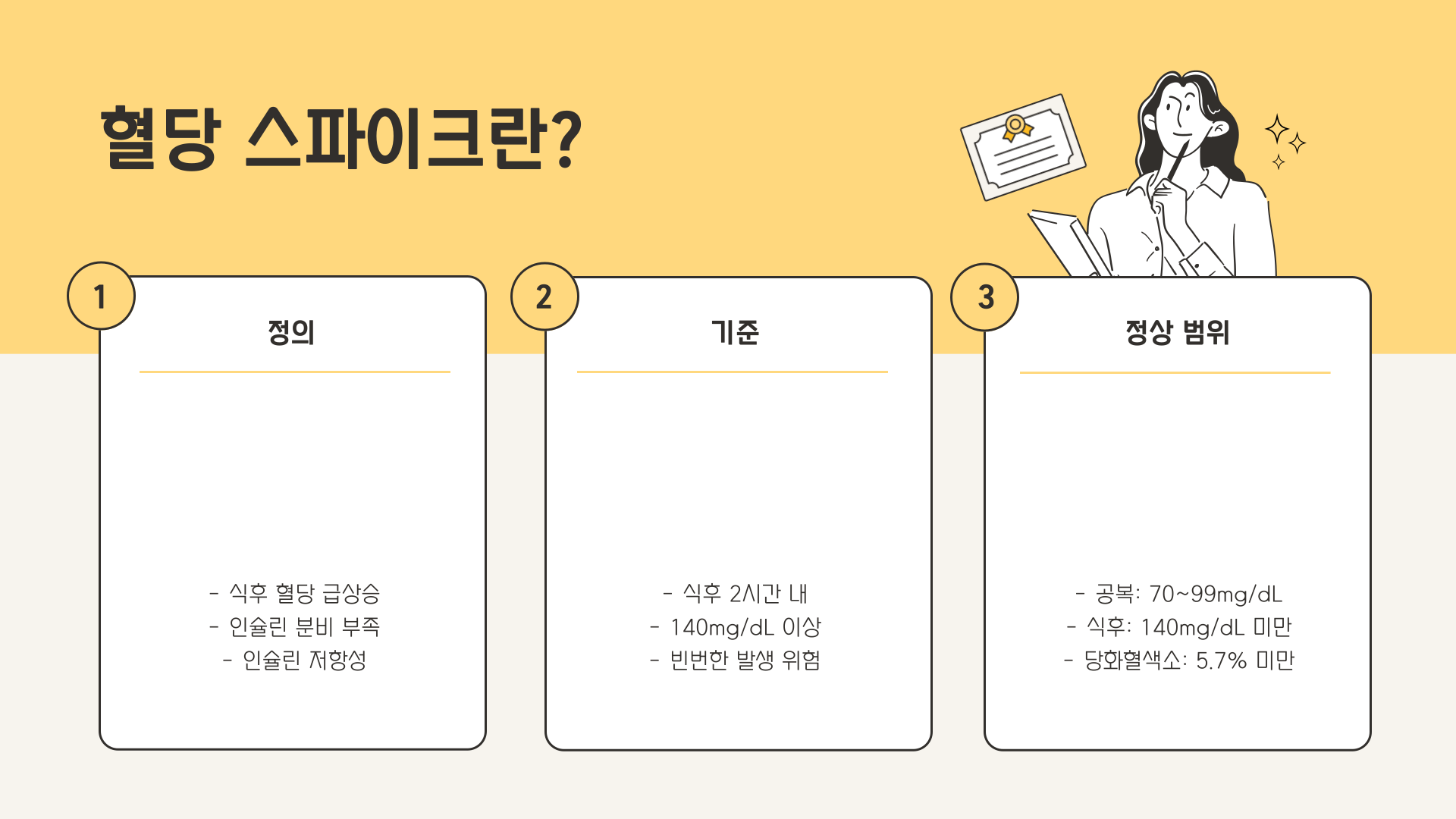 혈당 스파이크(Blood Sugar Spike)는 음식 섭취 후 혈당이 급격히 상승하는 현상을 말합니다. 보통 탄수화물과 당분이 많은 음식을 섭취하면 혈당이 올라가는데, 인슐린이 적절히 분비되지 않거나 몸이 인슐린에 저항성을 가지면 혈당이 비정상적으로 급등하게 됩니다.