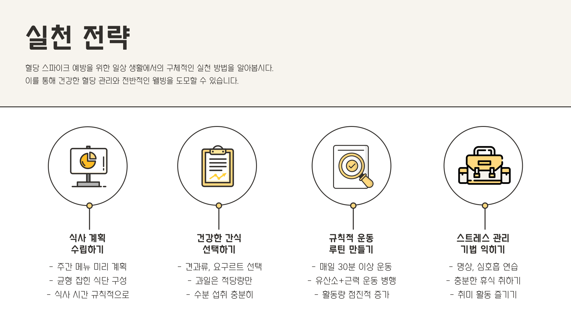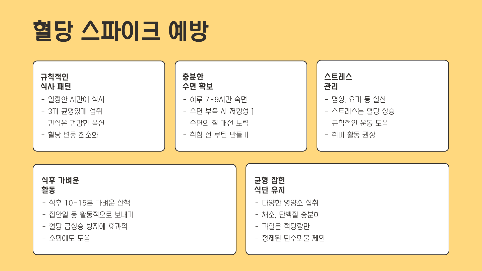 | 규칙적인 식사 | 혈당 변동 최소화 |