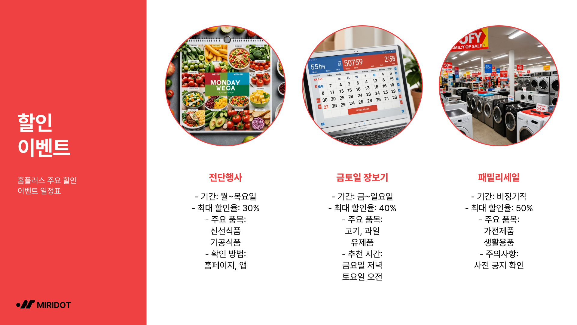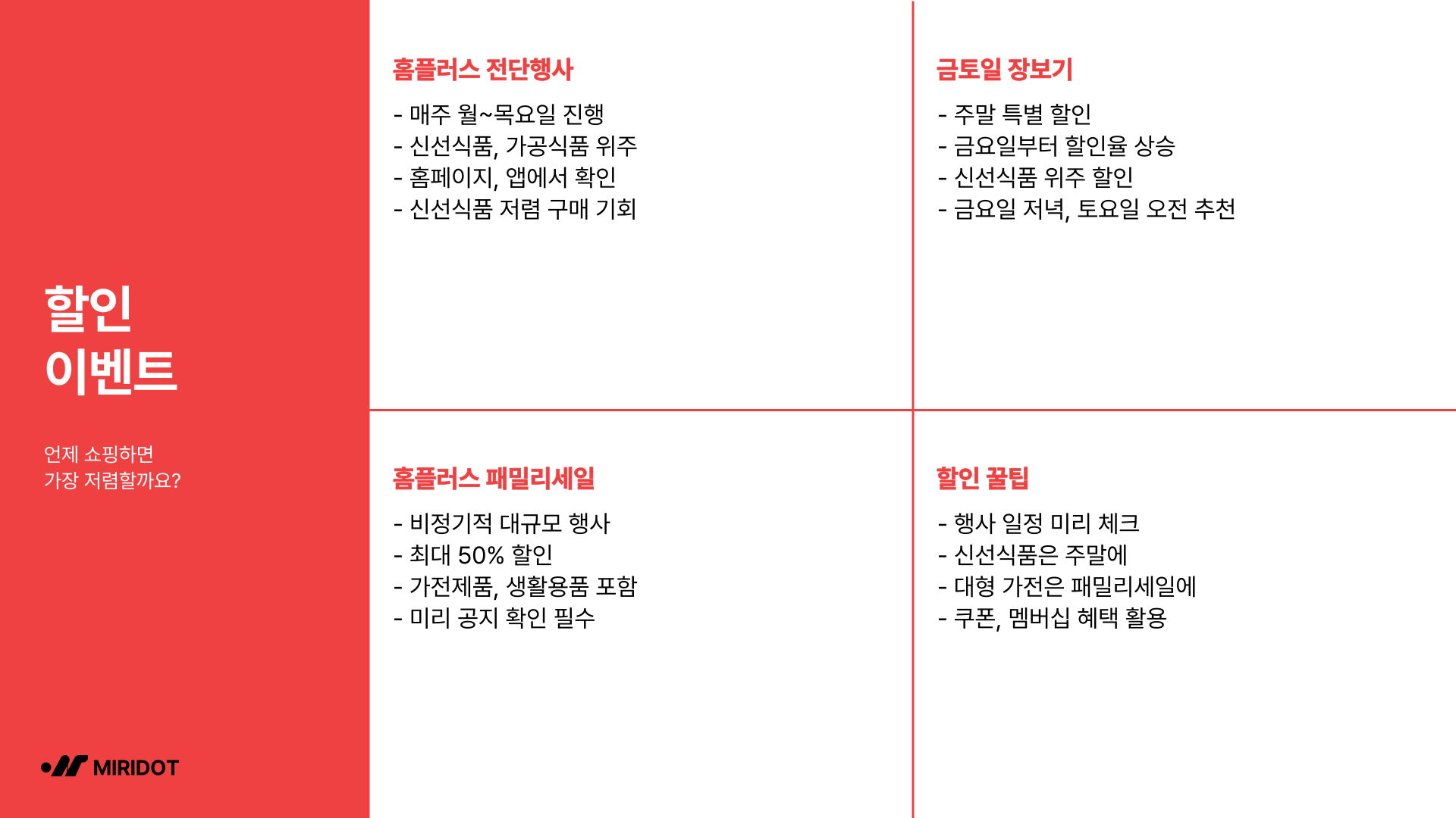 ✔️ 홈플러스 전단행사: 매주 월~목요일마다 진행되며, 신선식품과 가공식품 위주로 할인해요. 이 전단 행사는 홈플러스 공식 홈페이지나 앱에서 확인할 수 있어요. 신선식품을 저렴하게 사고 싶다면 꼭 체크해야 해요! 🛒