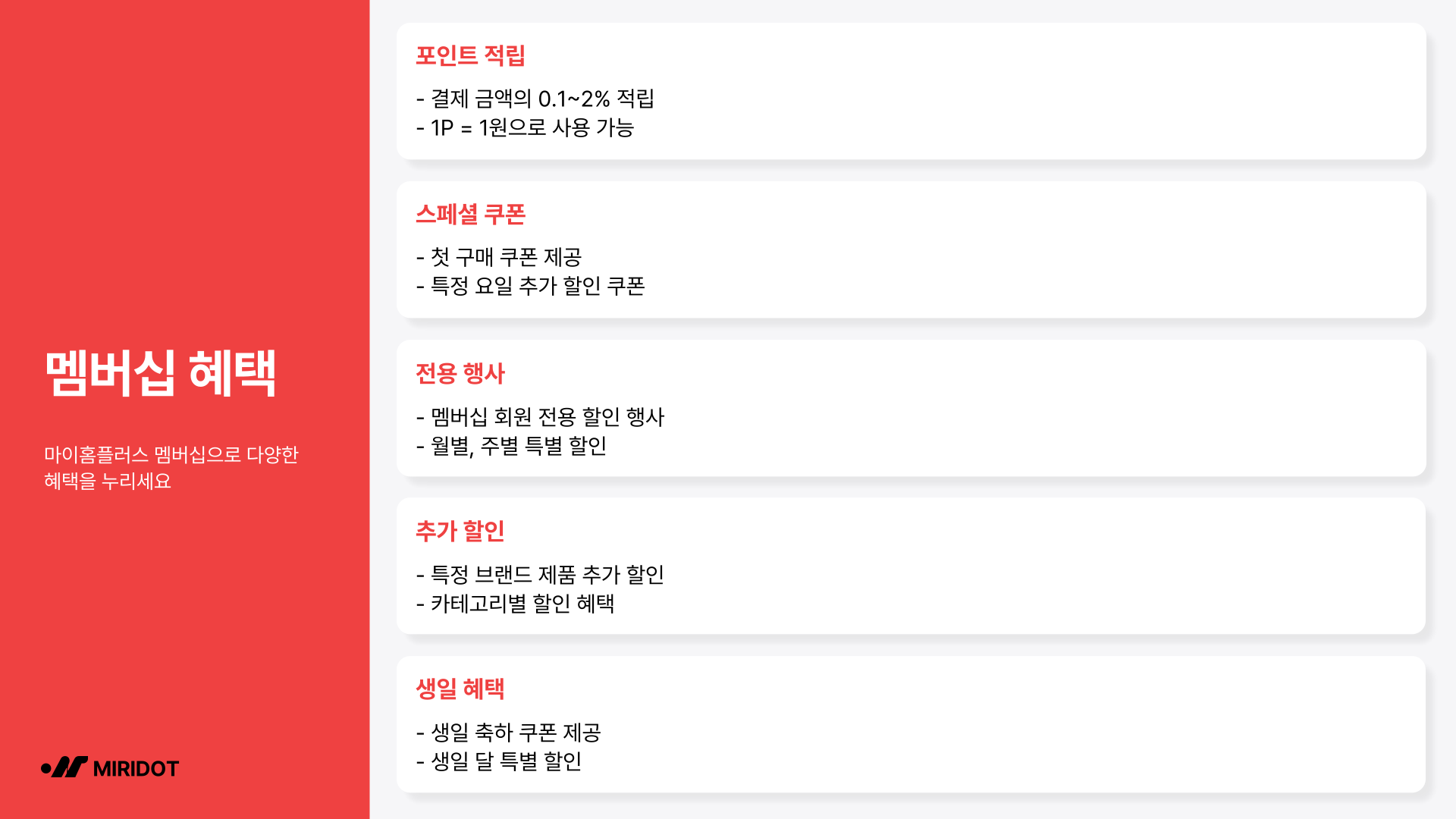 | 전용 할인 행사 | 멤버십 회원 한정 할인 이벤트 |