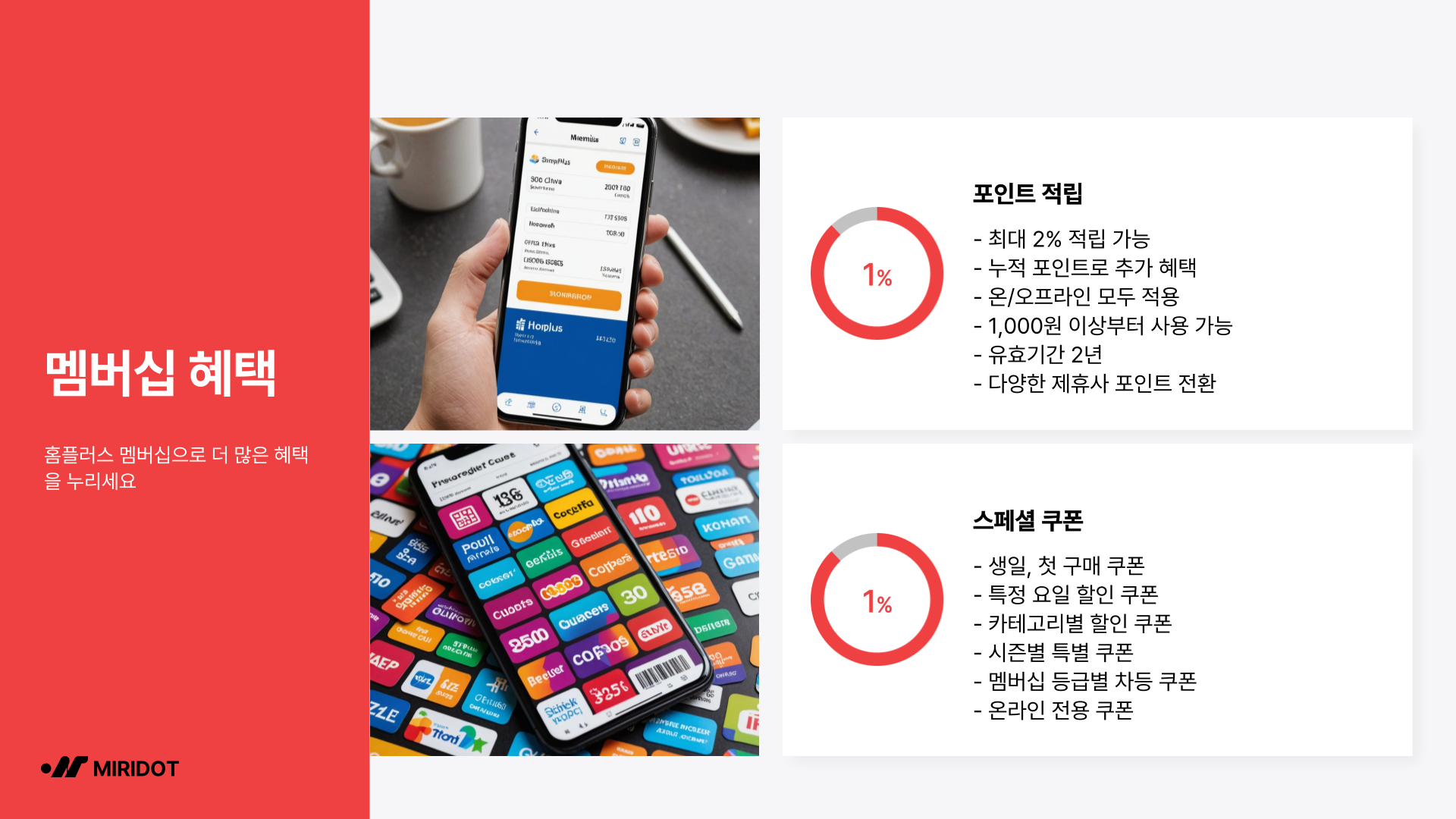 ✔️ 포인트 적립: 홈플러스에서 결제할 때마다 결제 금액의 0.1~2%가 마이홈플러스 포인트로 적립돼요. 적립된 포인트는 1P = 1원으로 사용 가능하며, 누적 포인트를 통해 추가 혜택도 받을 수 있어요! 💰